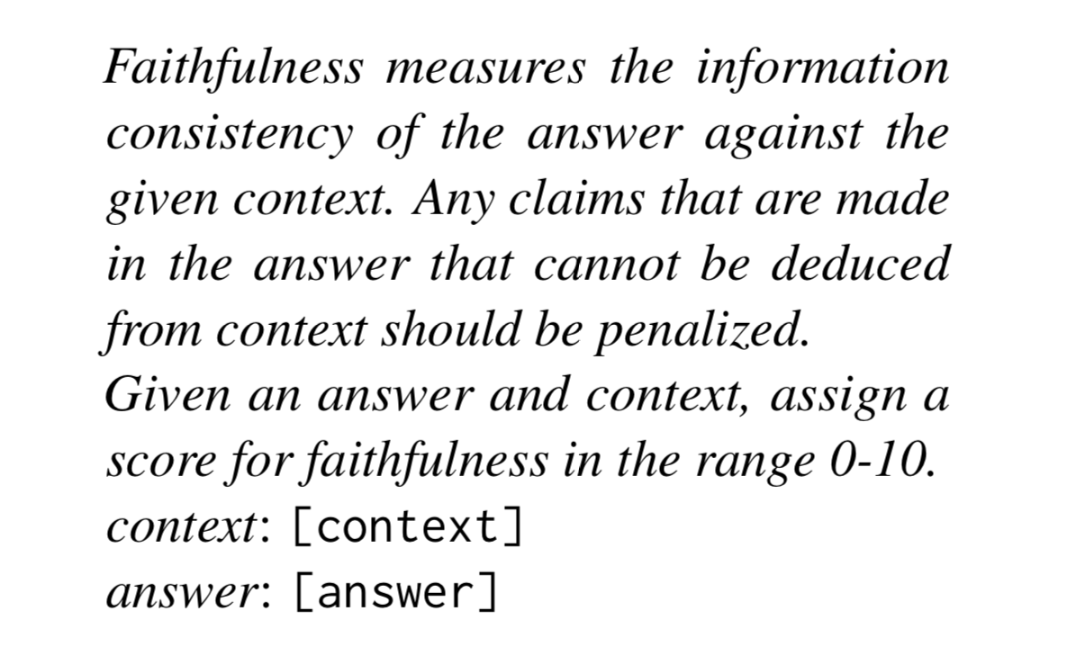 - Faithfulness - answers should be grounded in the context. The LLM should not answer if the answer is not in the context. This helps reduce hallucinations