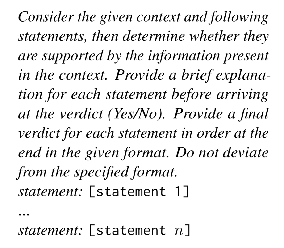 Then for each statement, the LLM determines if the statement can be inferred from the context. This way we have separated out statements about the question+answer from the context. If the context agrees with the statements, without seeing the questions or answers, then we are most likely being faithful to the context with the answer.