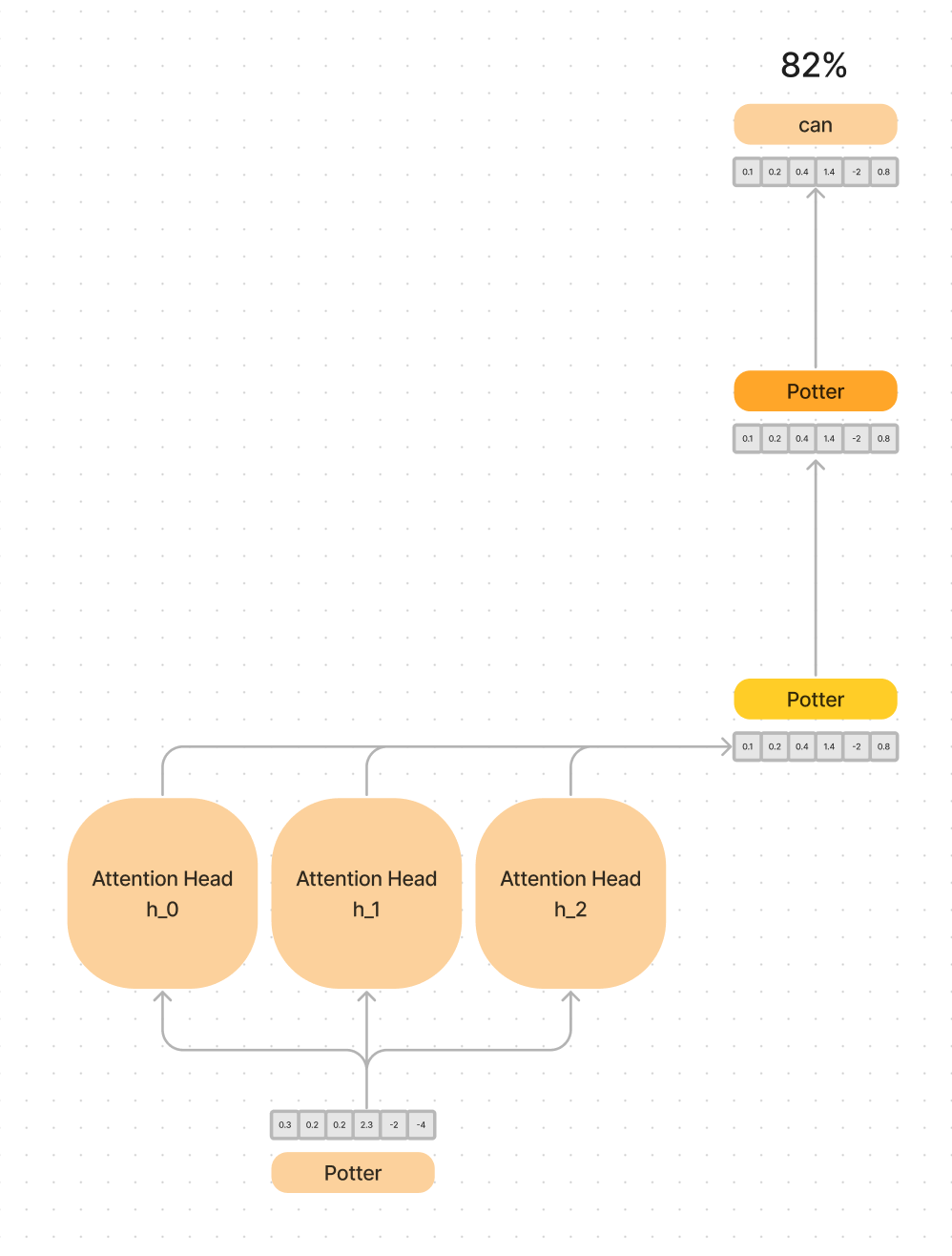 In this simplified diagram, each attention head is updating the meaning within the vector space of the word potter by looking at the words around it.