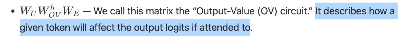 OV = WO*WV = the deciding on the output meaning of the word into the residual stream, to make the prediction.