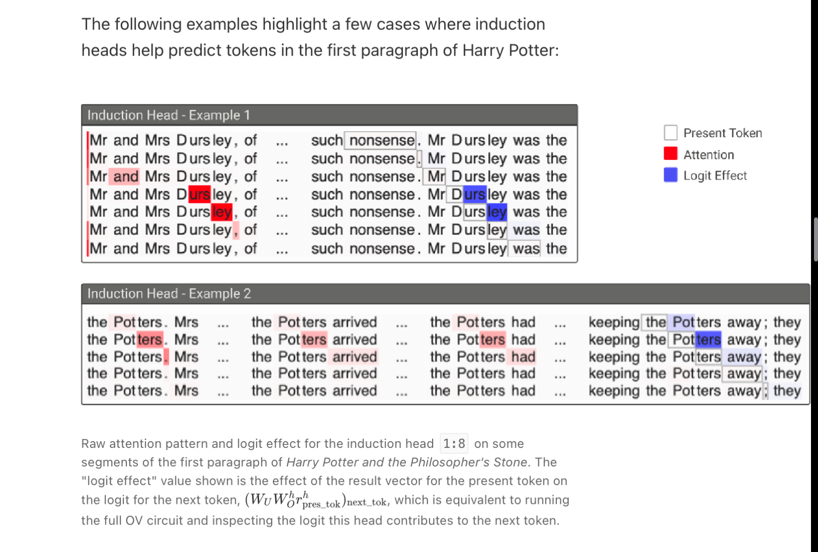 Induction heads search over the context for previous examples of the present token, if they donât find it, they attend to the first token and do nothing. If they do find it, they look at the next token and copy it. This allows them to repeat previous sequences both exactly and approximately.
