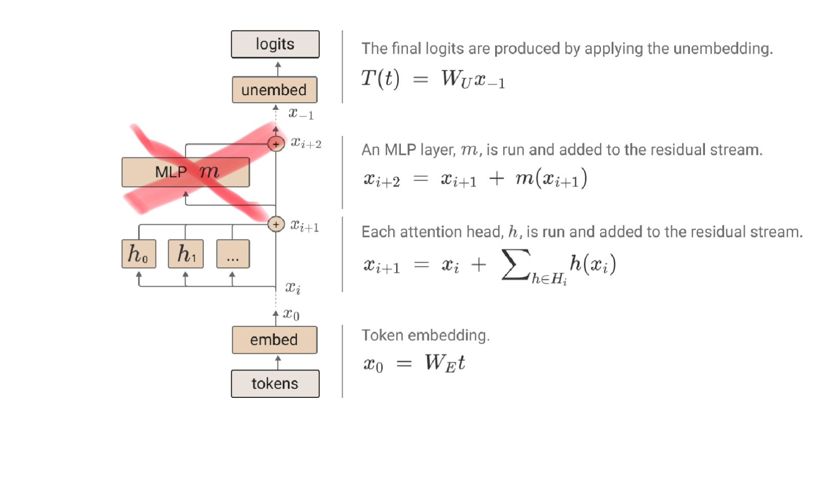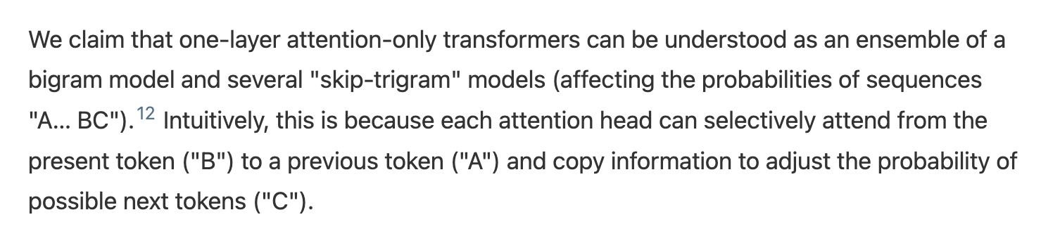 The one-layer attention-only module is simply a giant pile of cards that the models is choosing from and combining common skip-trigrams that it has seen before.