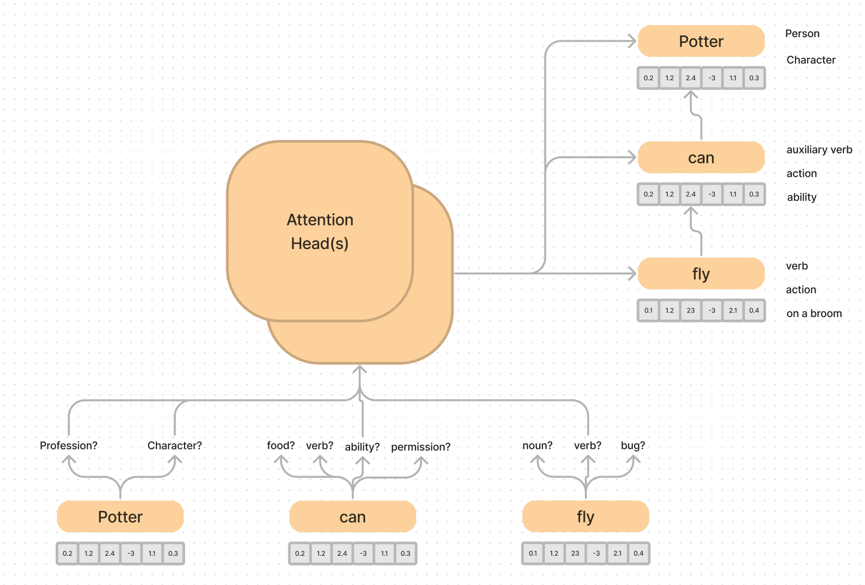 For example, think of our first three words from before. âPotter can flyâ. They are each represented by a word embedding that has a vector of numbers that correspond to different meanings the word could take on.