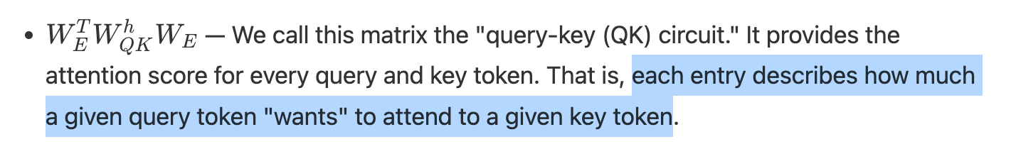 The query-key (QK) circuits job is call out from word to word and combine meanings in the sentence.