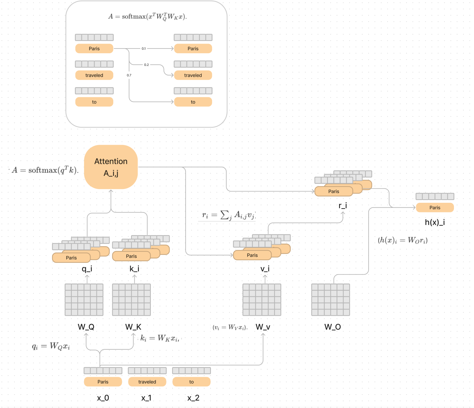 The gray box is the current token we are on, you can see it looks back at where it was used before, the query is a combination of itself and some words around it, the key is a combination of what we are attending to and the words around it, and then the value is used to move this information together to predict the next word.