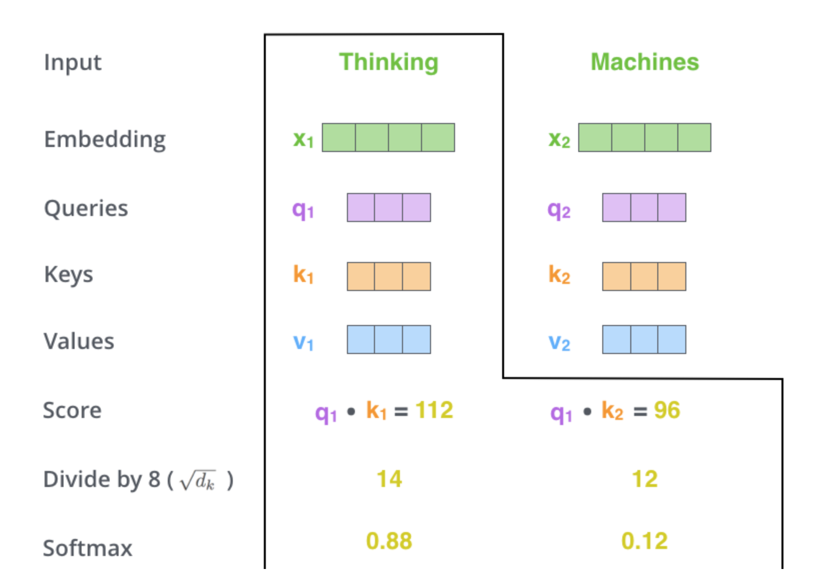 I love this example from âThe Illustrated Transformerâ to see what the actual softmax scores might look like.