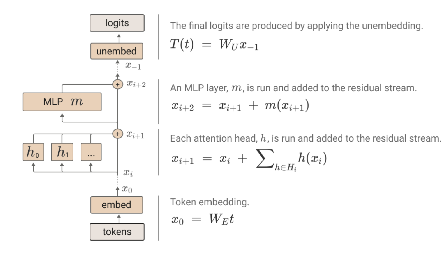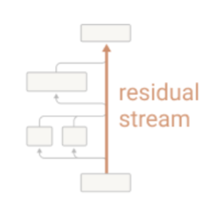 Back to a modified version of the diagram, both the attention and MLP layers âreadâ their input from the residual stream, and âwriteâ their result to the residual stream. Passing information along at each step.