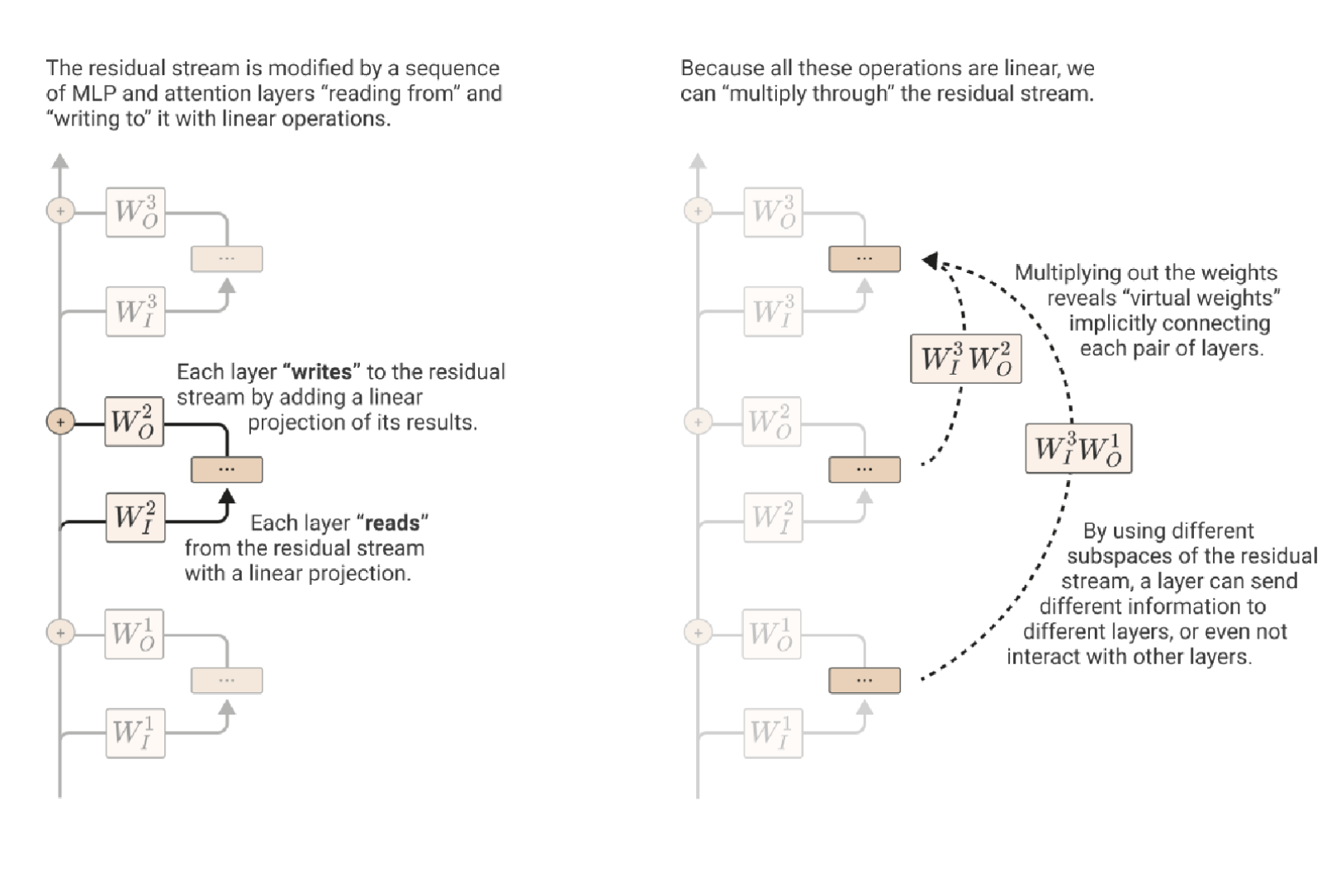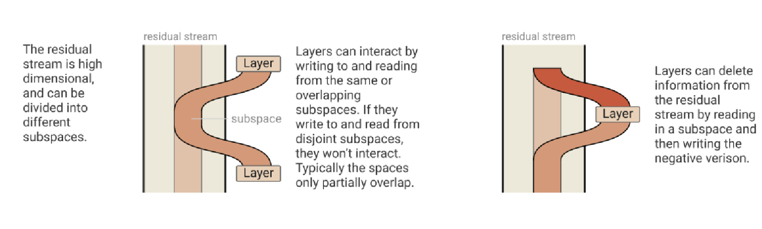 Every layer âreadsâ from the residual stream with an arbitrary linear transform at the start, then âwritesâ to the channel with an arbitrary linear transform at the end.