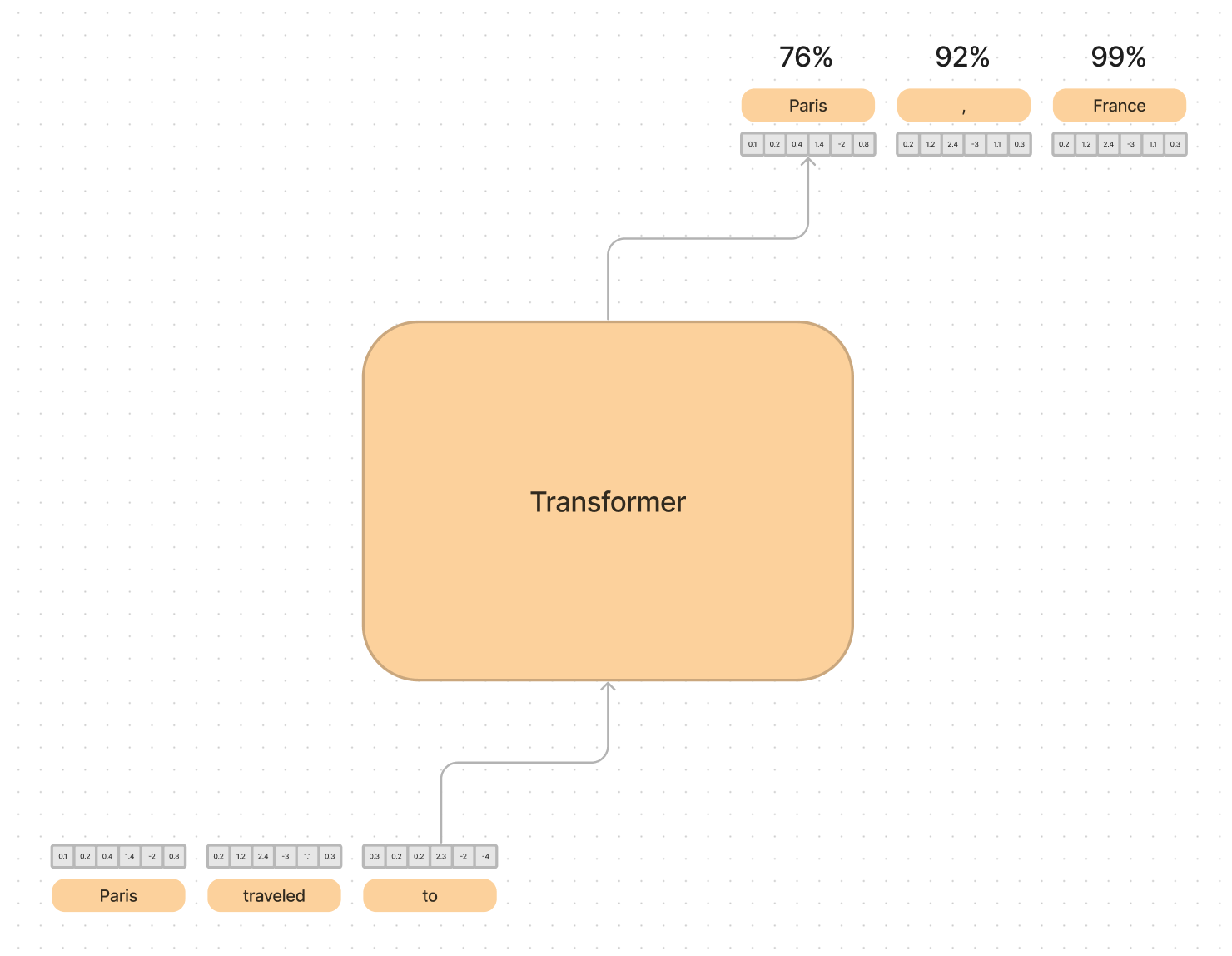 I like to high level conceptualize that as an external observer of the model we are taking in tokens as strings, and producing new tokens as strings. Letâs ground ourselves to an actual sentence.