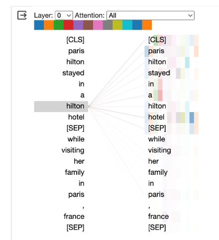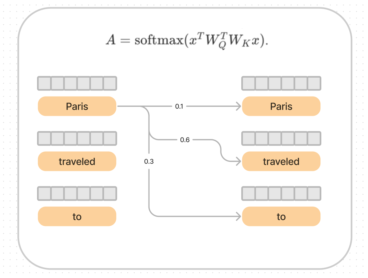 In the diagram above, Paris wants to take (0.6 * traveled) and (0.3 * to). In longer sentences these values will be much smaller, because the all have to sum to 1.0.
