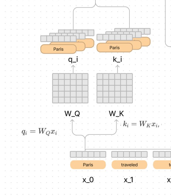 To break this down into a series of steps, I would start with the x_i being the embedding representation of the word (bottom left), and think about what the query and key weight matrices are doing.