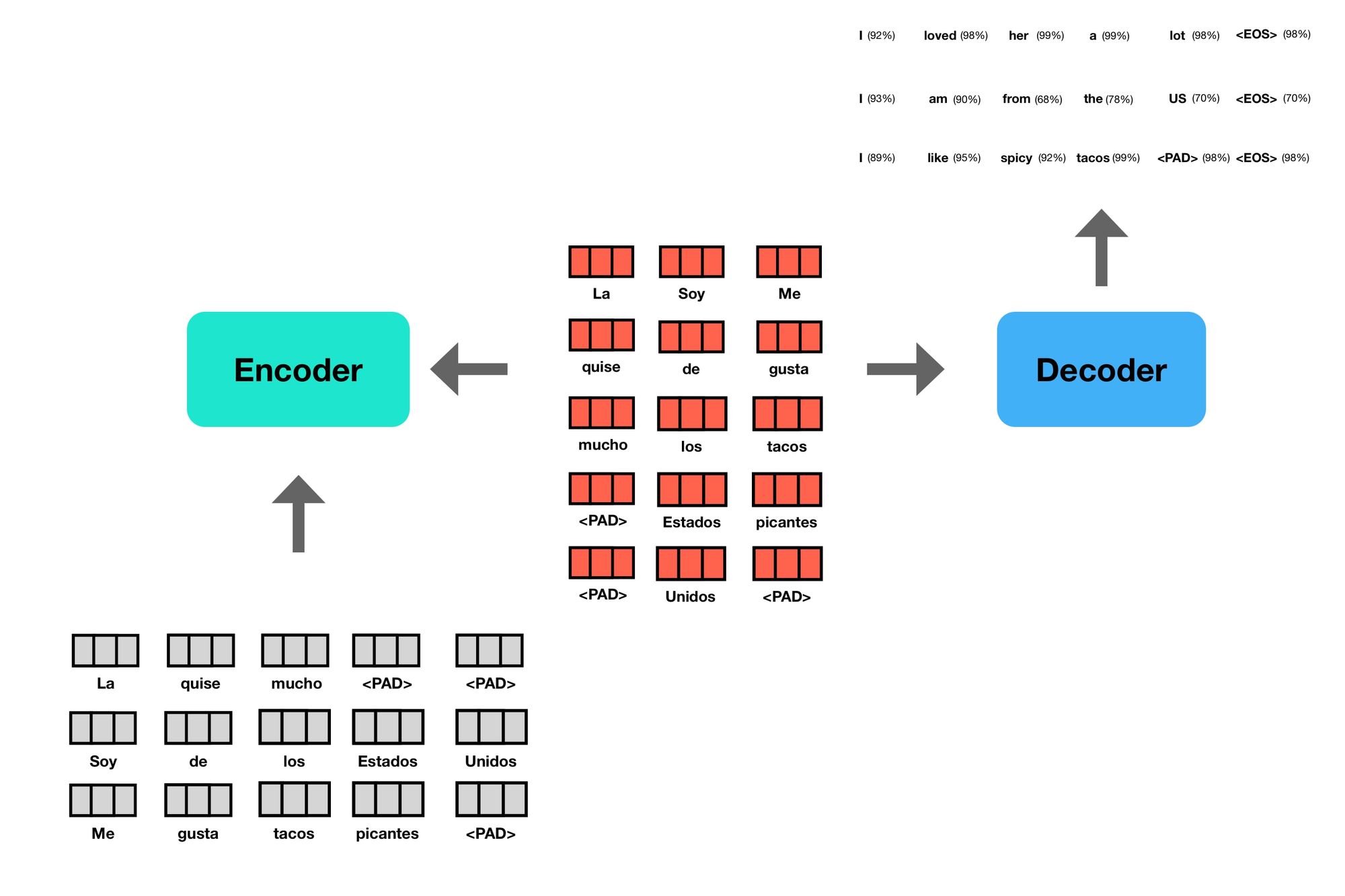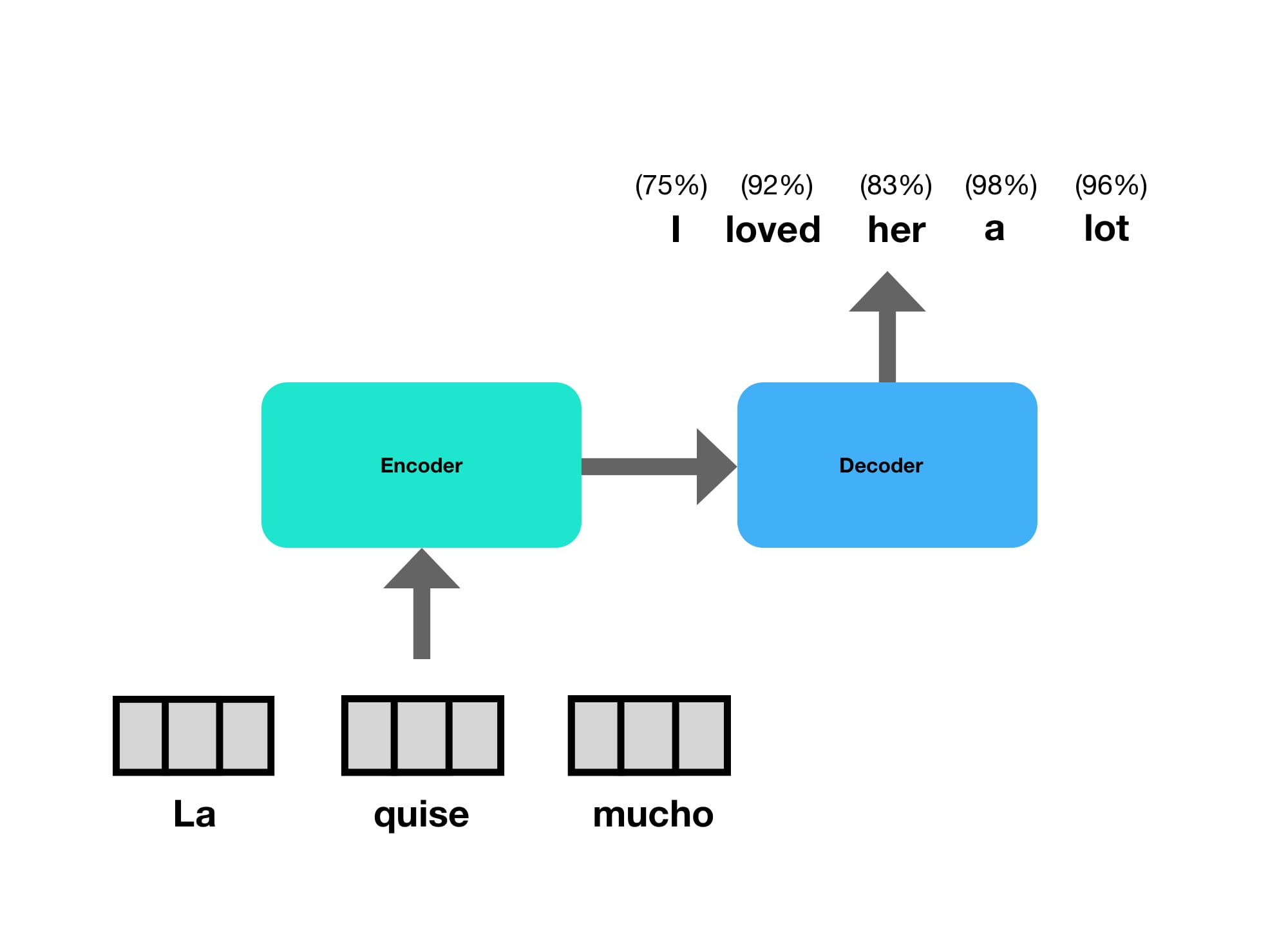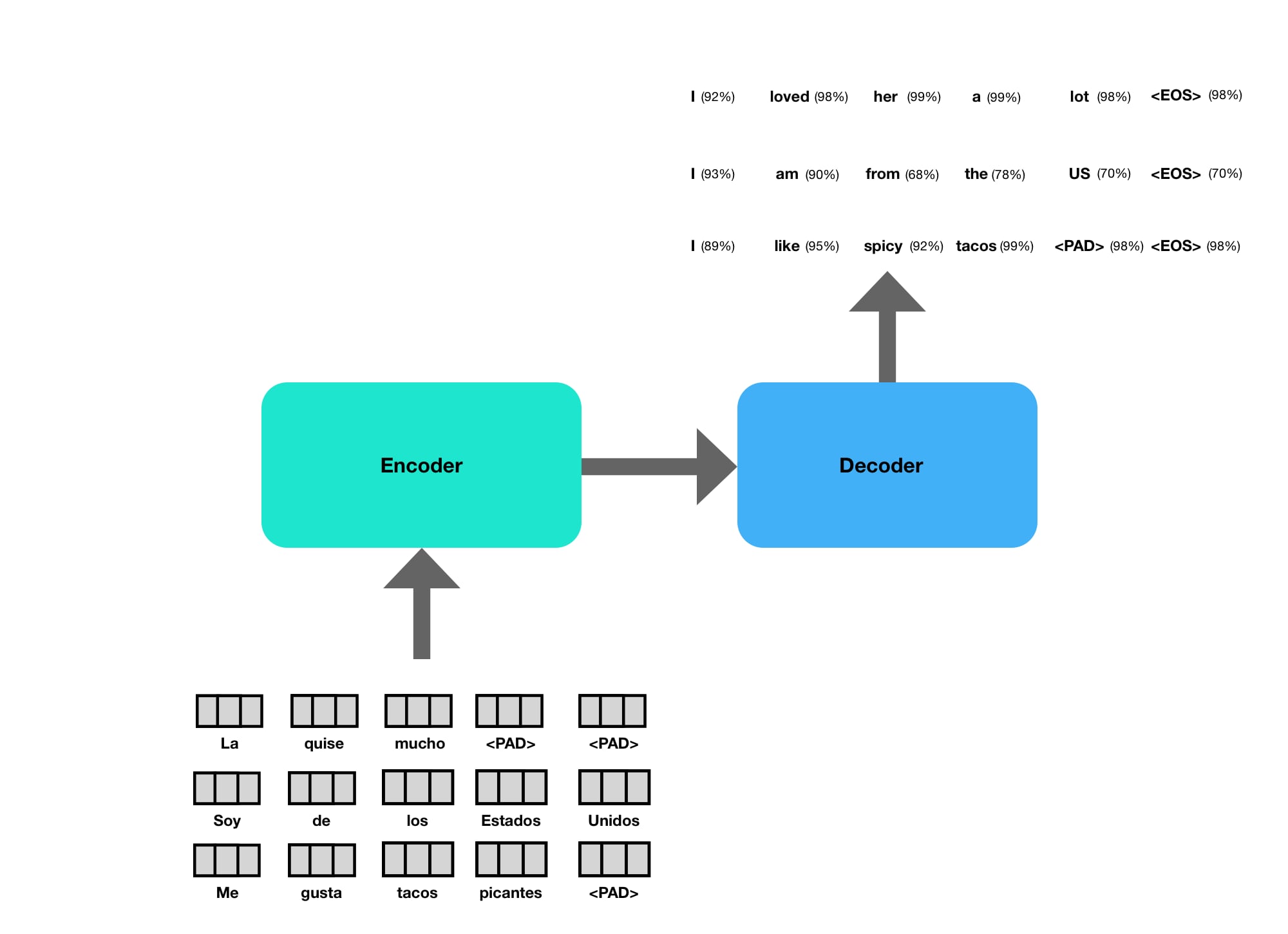 The decoder then takes in a processed representations, as well as previously generated word embeddings, and outputs probabilities for each word in the output.