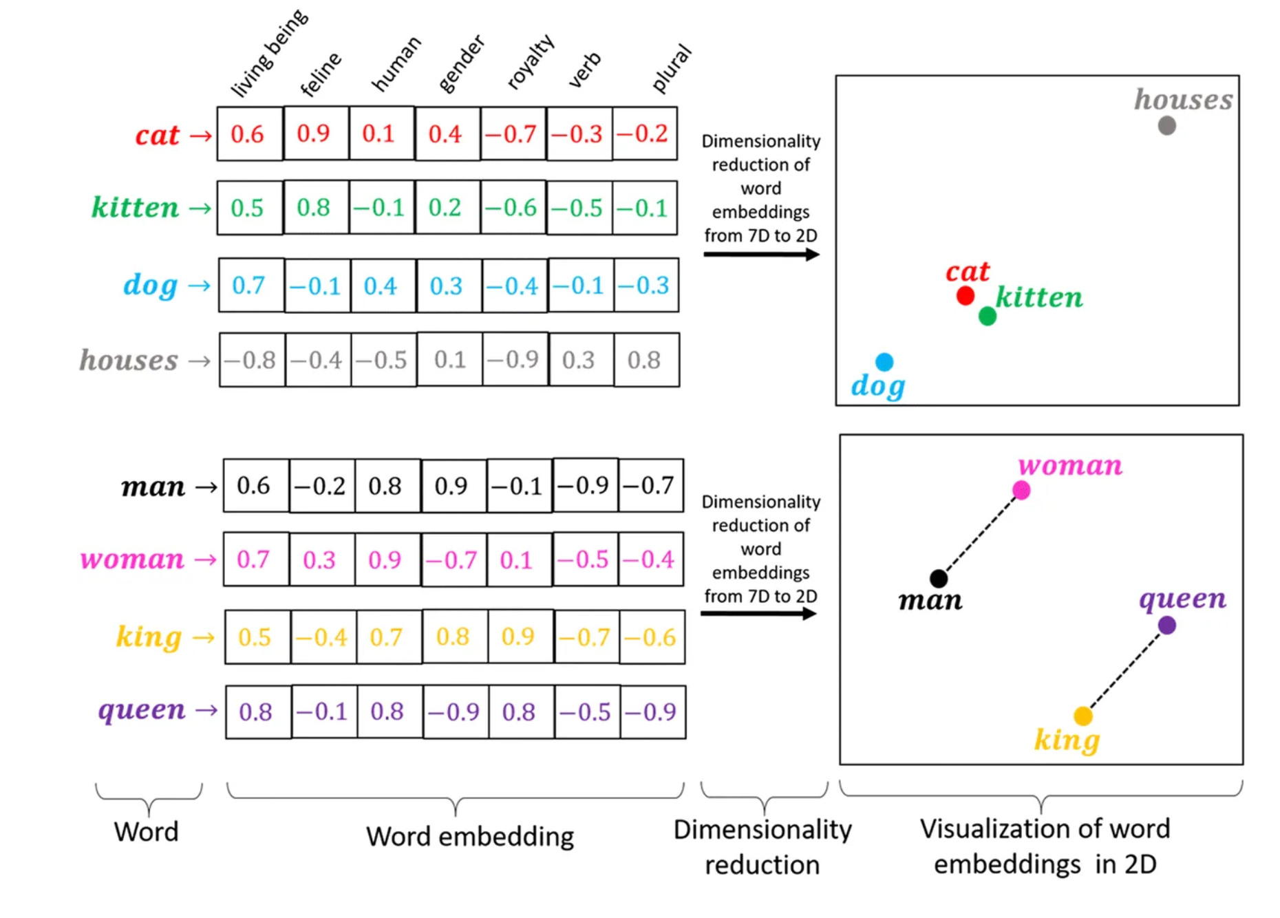 Words have complex meaning that can be represented as a distributed vector of numbers. We could have a whole dive on how they are created during training or pre-training, but here is a high level view of what they are trying to capture.