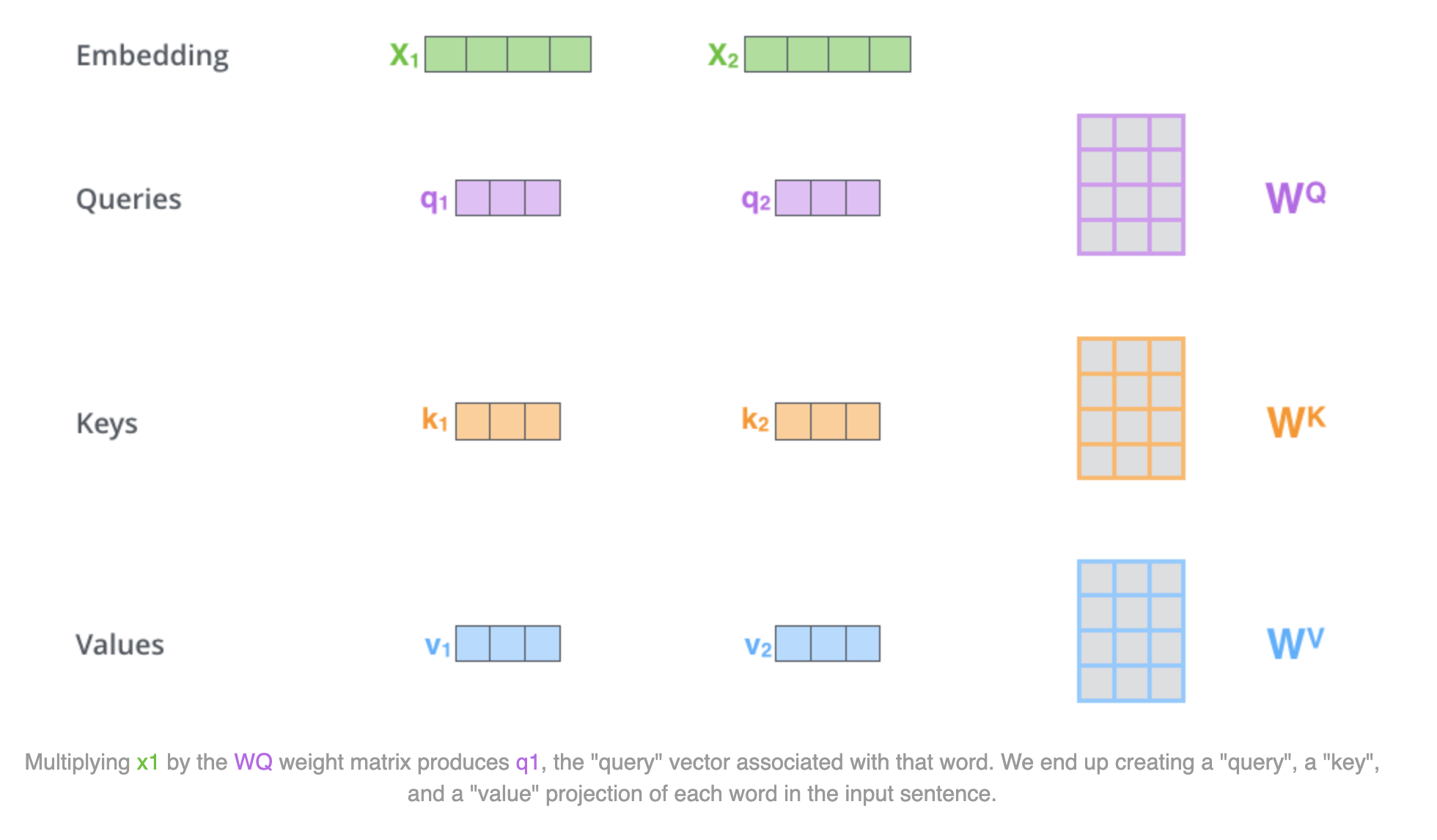 Each word in the sentence has a corresponding a âqueryâ, âkeyâ, âvalueâ, and âoutputâ vector, that is computed given a set of weights.