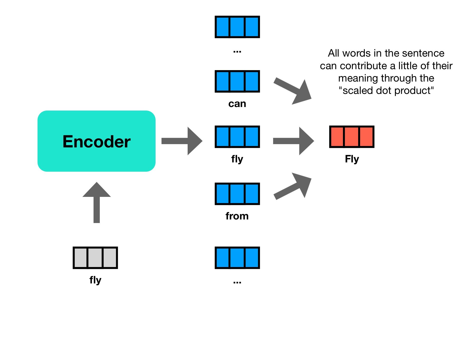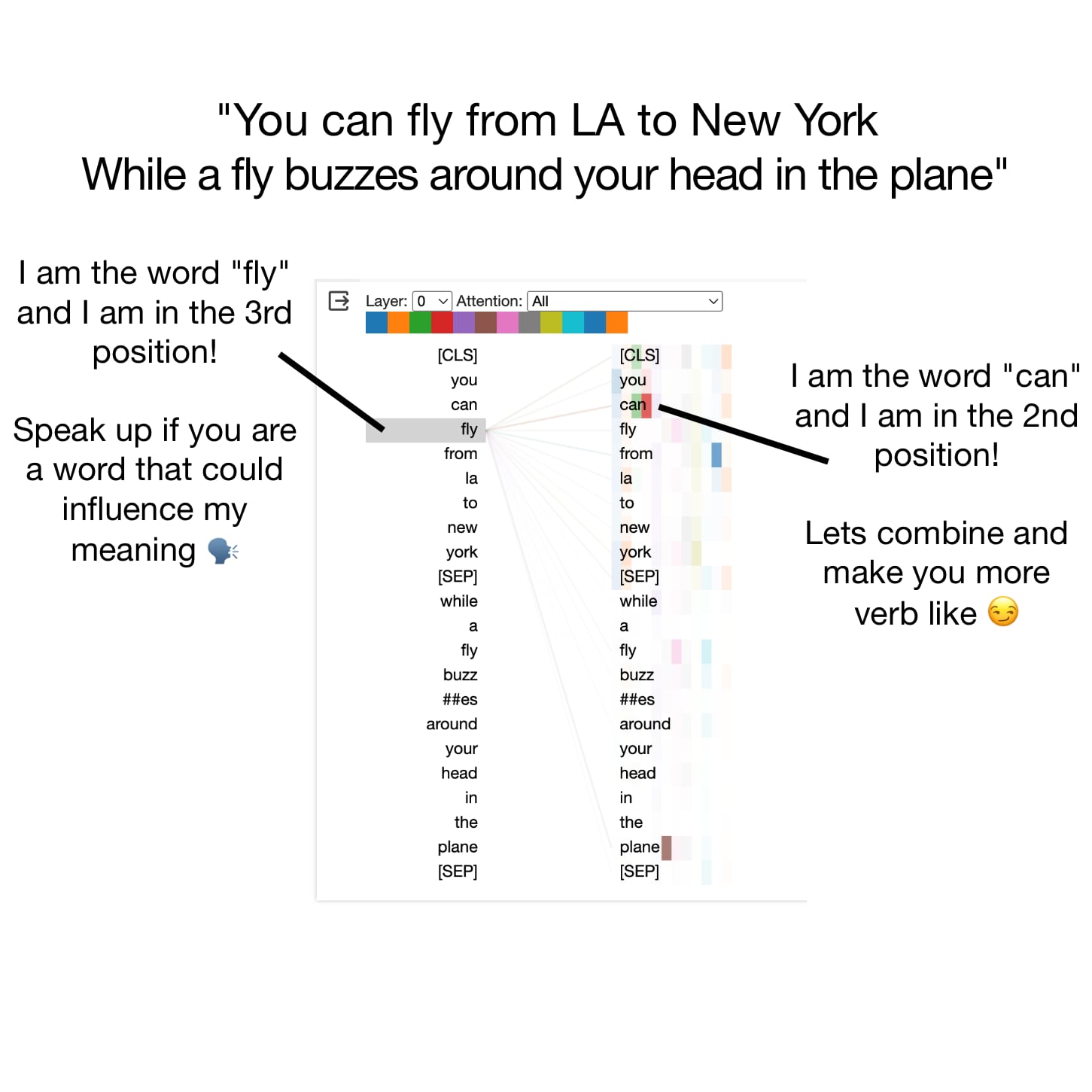 Since all of the queries and keys can be thought of as word vectors plus information about their position (see positional encoding later), you can think of âflyâ sending itâs query out to all the other words saying âI am the word âflyâ in position 3, I am looking for surrounding prepositions or auxiliary verbs that may influence whether I am a noun or a verbâ.