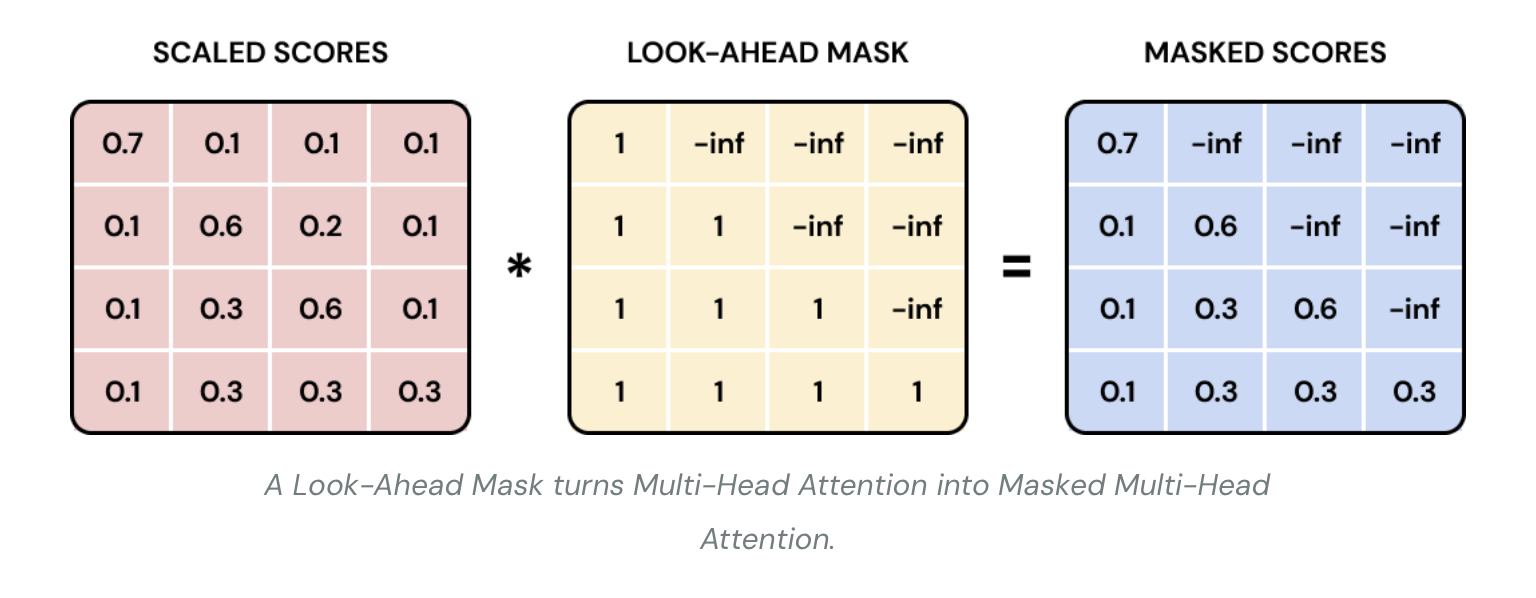 The decoder has to mask the future outputs so that it cannot âpeek aheadâ during training at all of the outputs because that would be cheating. So when you see âmasked multi head attentionâ, thatâs all this means.