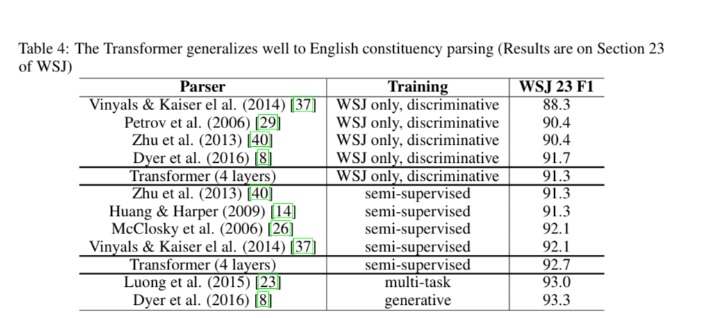 They train a 4-layer transformer with size of 1024 on the Wall Street Journal (WSJ) portion of Penn Treebank, which is an annotated dataset of constituency parses. There are about 40k sentences.