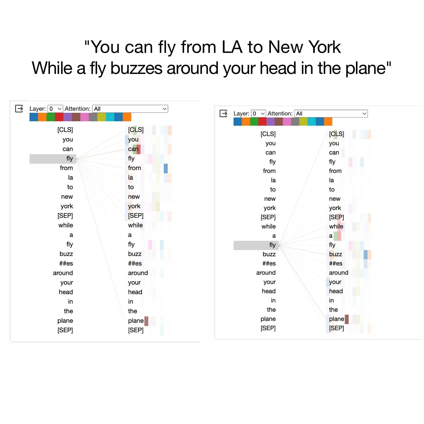 You can see in the following sentence, the first instance of "fly" is a verb, and attends closely to the word "can" before it, "from" after it, and the locations you are flying to. While the second instance of "fly" is more interested in the words "buzz" and "while a". If you think of it, you can pretty quickly disambiguate a noun from a verb with "a fly" versus "can fly".