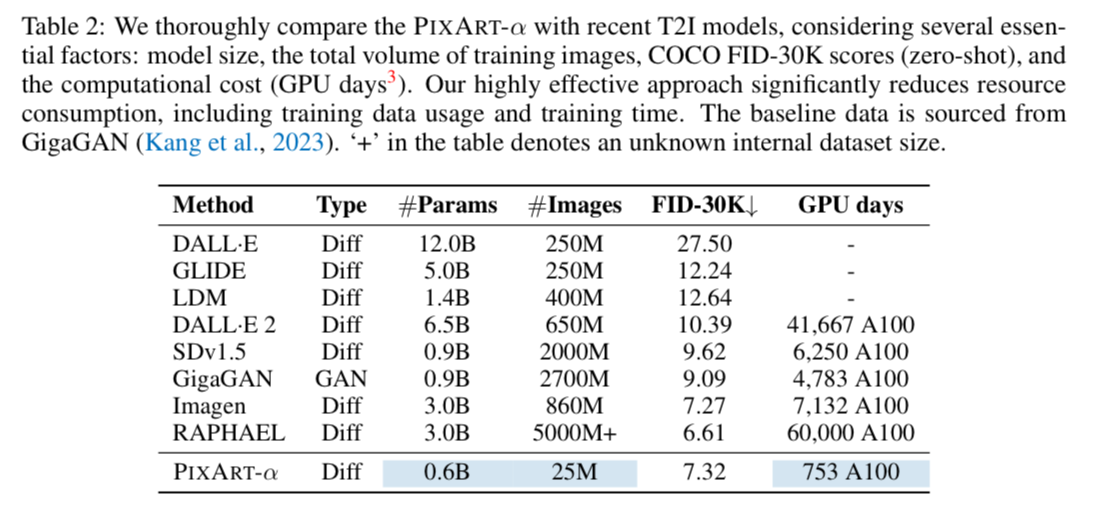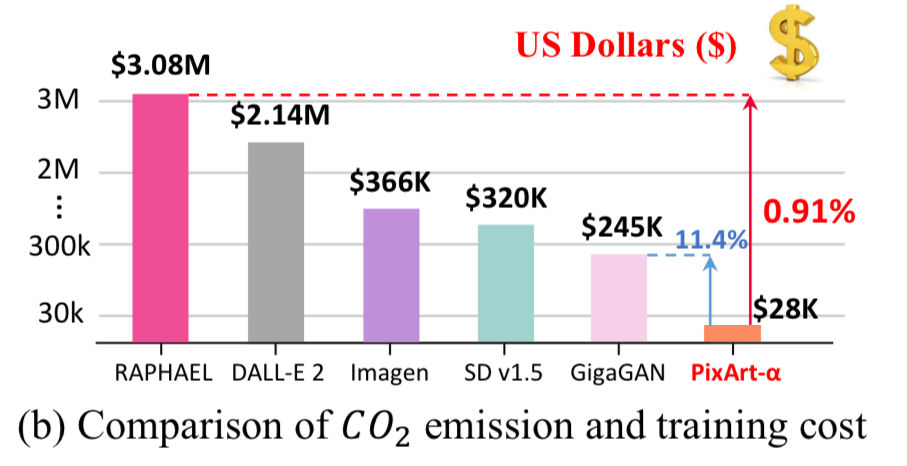 For reference, Stable Diffusion takes 6,000 A100 GPU days. This costs ~$320,000 to train. PixArt takes only 12% of Stable Diffusion’s v1.5 training time, saving nearly $300,000
