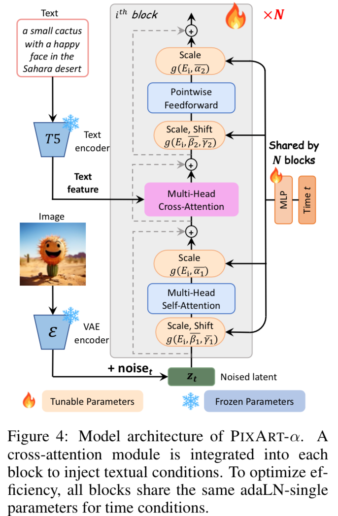 They also reduce the model’s size by incorporating a global MLP that takes in the time dimension (right side) and a single AdaLN layer. They say that this along with the cross attention with the text encoder allows you to reduce the model’s size while maintaining generative abilities.