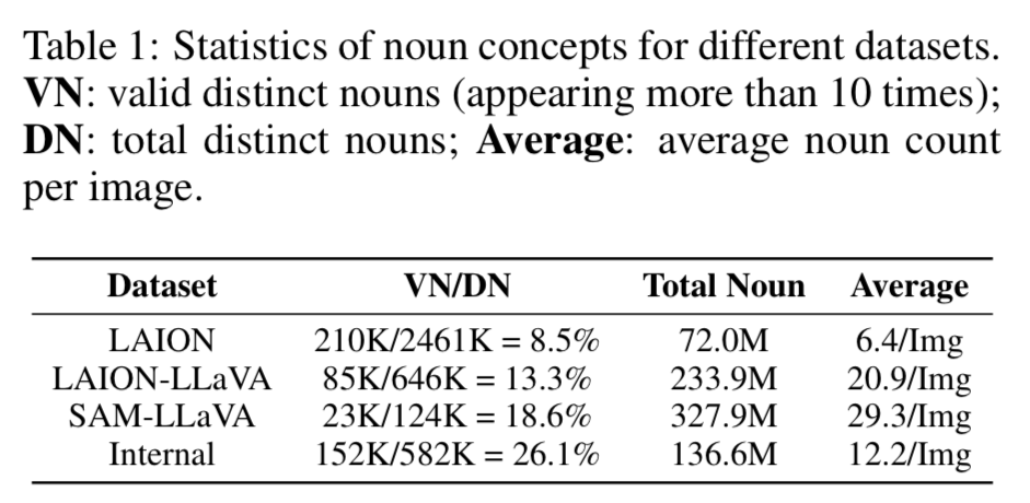 They then analyze the noun distribution between the datasets to show how they have more diverse concepts in theirs.