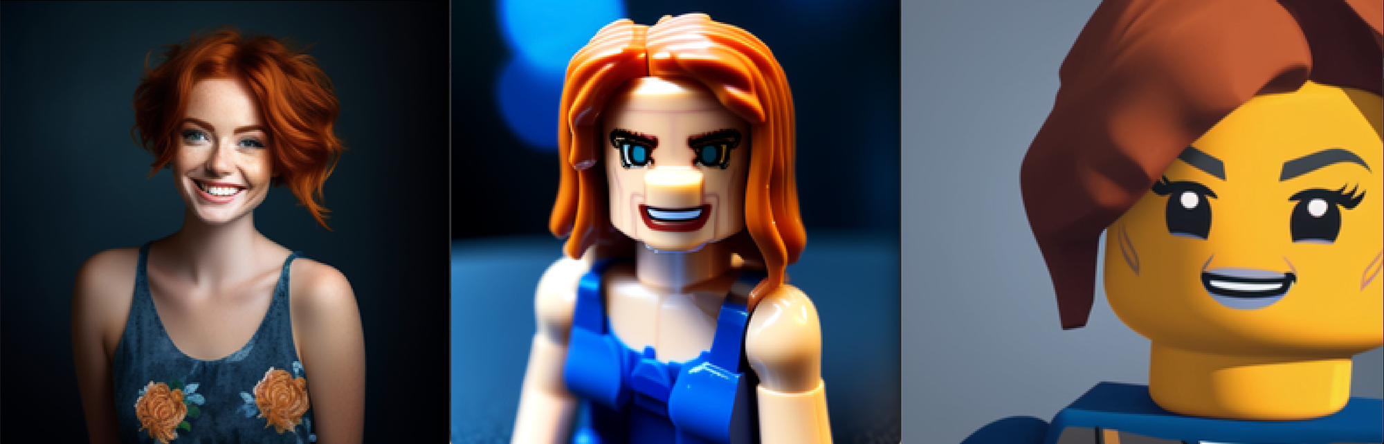 b. Image in lego city adventures style, beautiful lady, freckles, big smile, blue eyes, short ginger hair, dark makeup, wearing a floral blue vest top, soft light, dark grey background