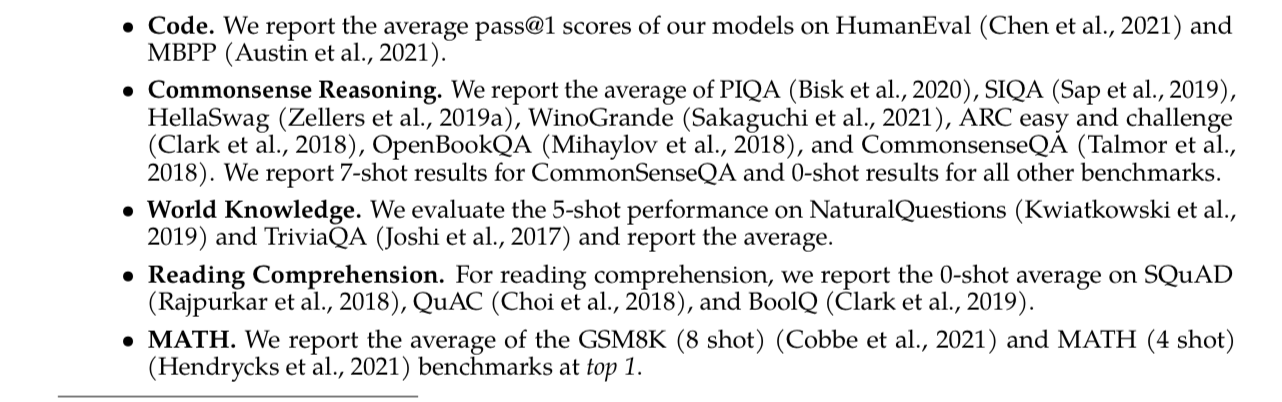 - Commonsense Reasoning - PIQA, HellaSwag, WinoGrande, ARC, OpenBookQA, CommonSenseQA datasets
