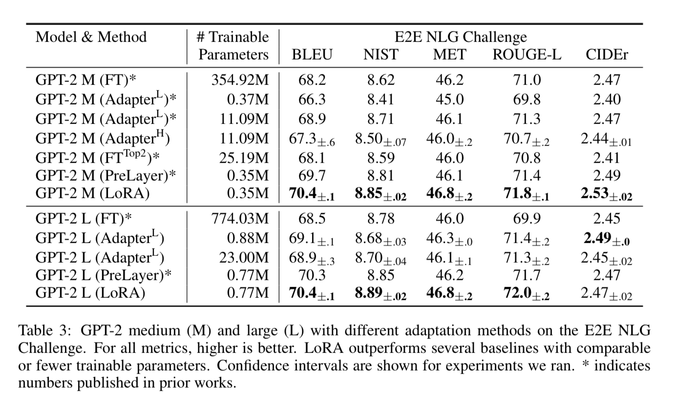 Even though the number of trainable parameters is much smaller, you can see the performance when applied GPT-2 exceeds a lot of the Adapter and PreLayer approaches.