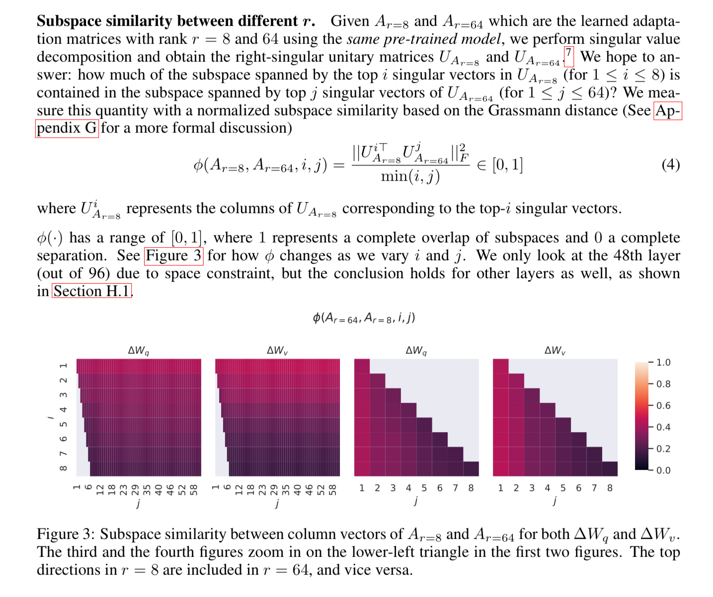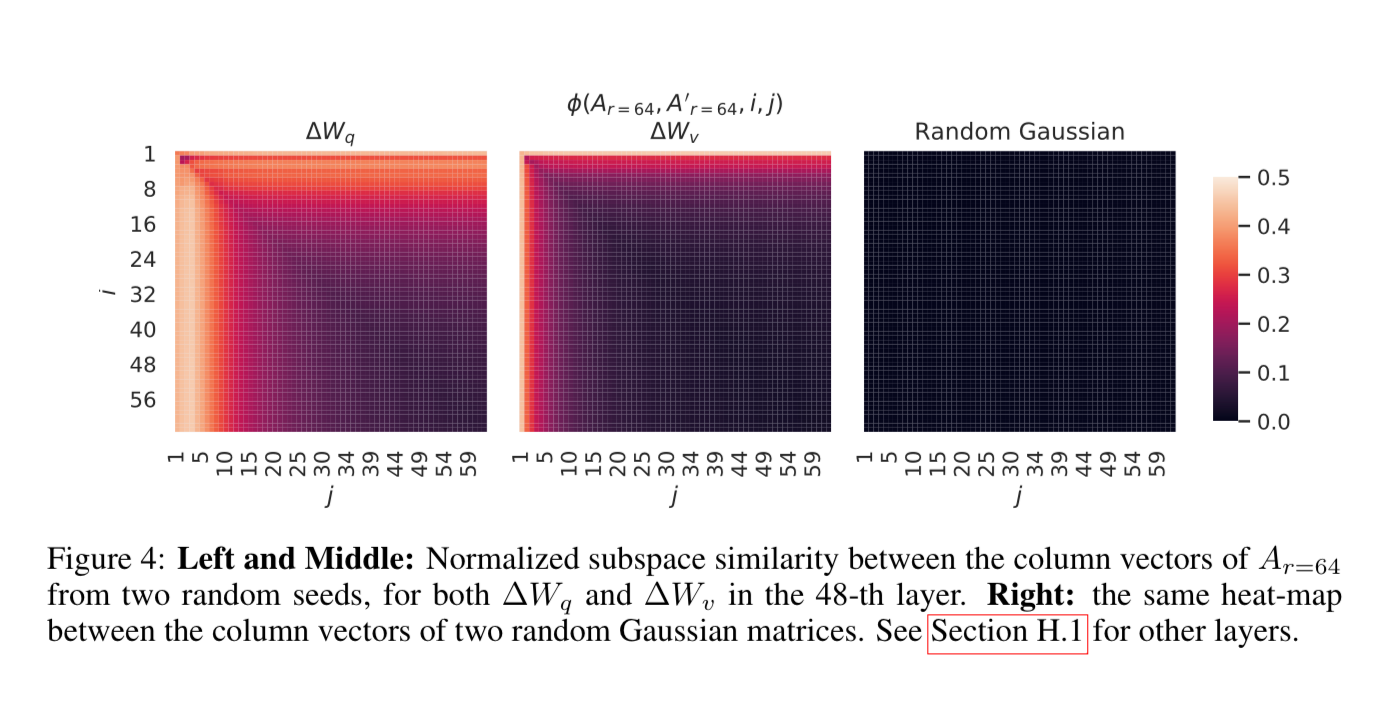 They used singular value decomposition to try to answer how much of the subspace is spanned by the top i singular vectors, and found that if you look at the similarity of the vectors, they are quite high, until you get to that dimension of 1, which is maybe why lower rank performs better.