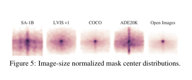 This is kind of cool, they look at if you average the mask centers over different datasets, where most of the masks lie. You can see the segment anything dataset (and the ADE20k dataset) are by far the most diverse. Others could easily overfit to just predicting masks in the center of the image.