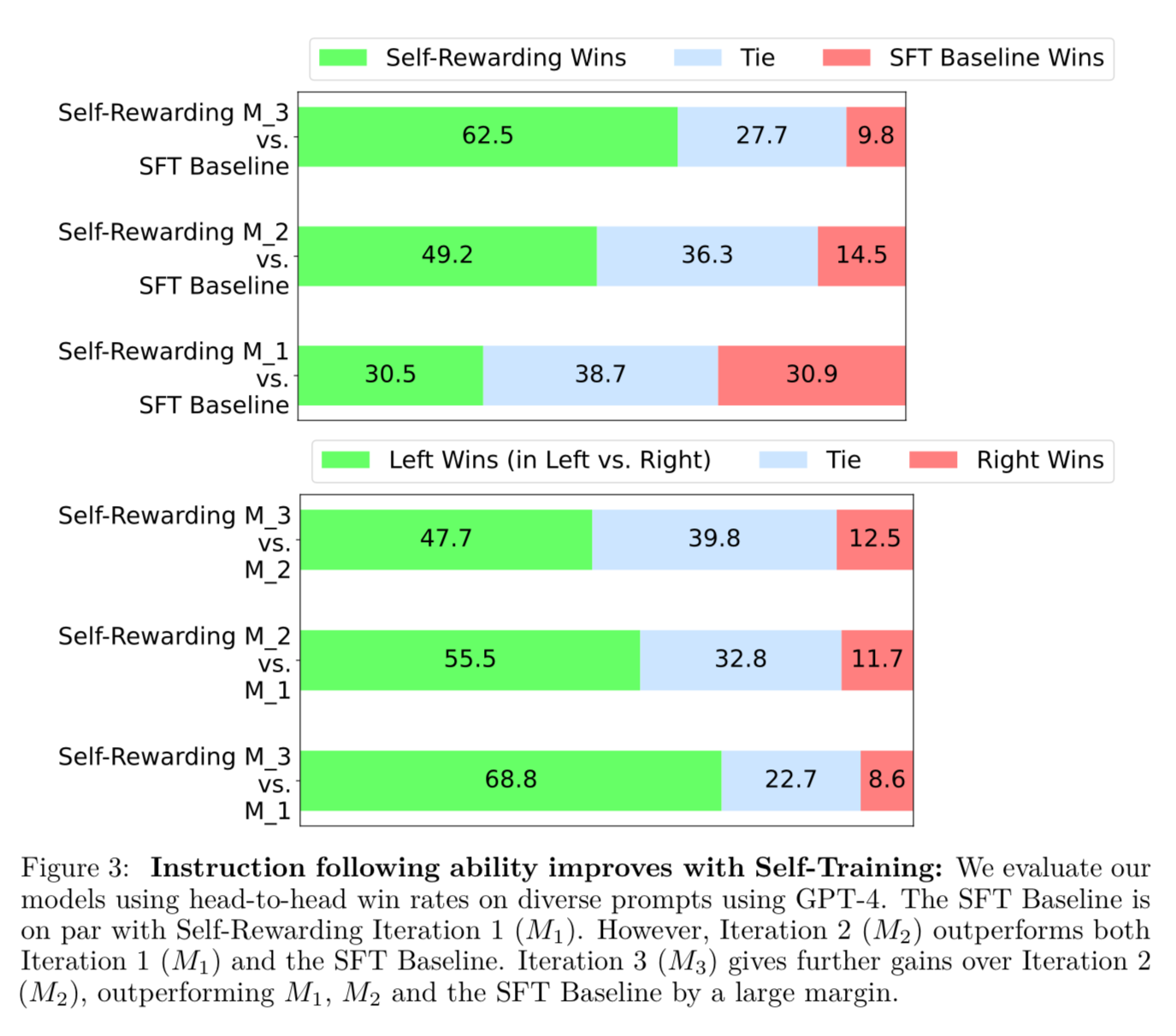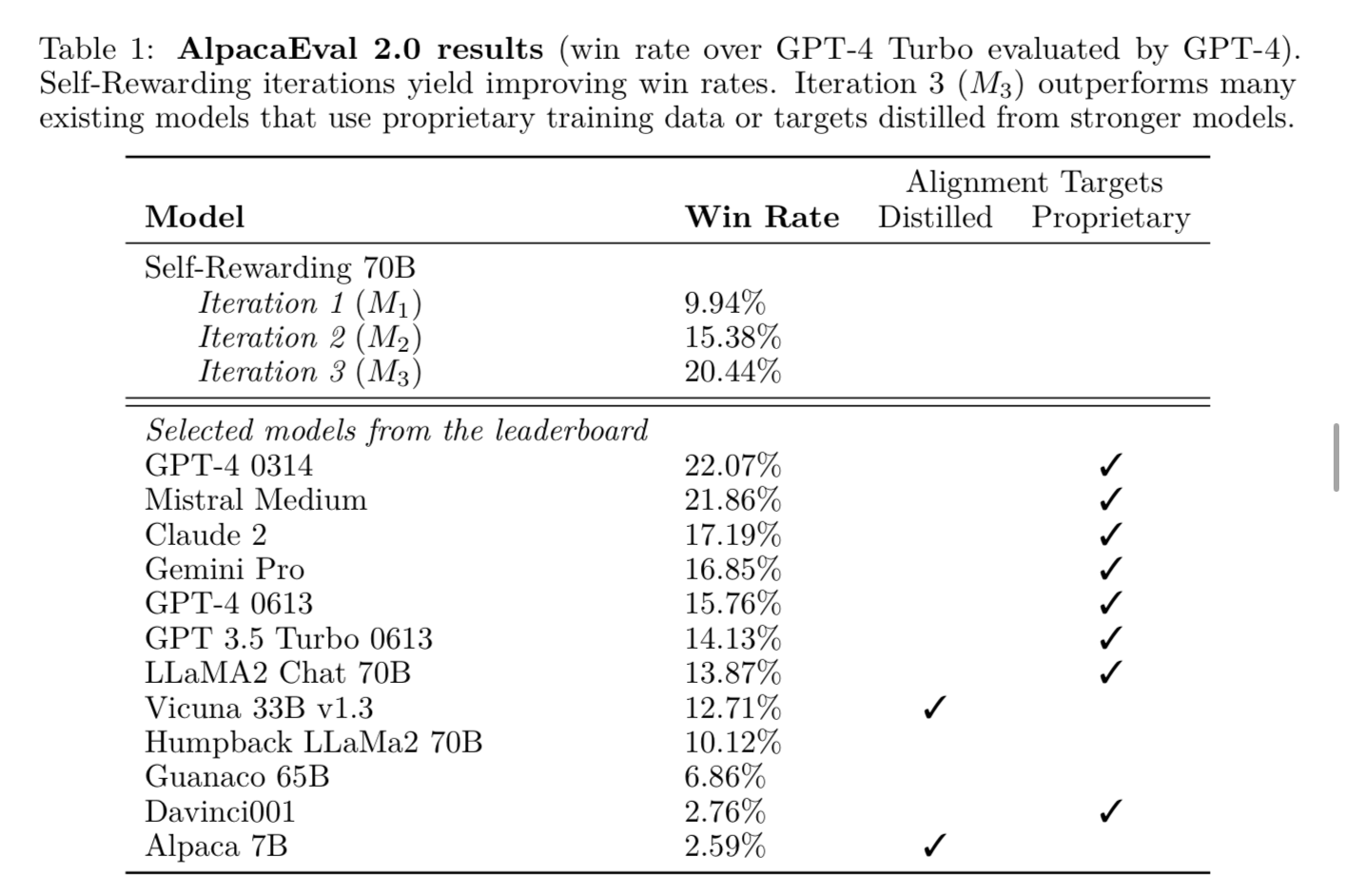 This is exciting because some of the models on the leaderboard here (Claude 2, Gemini Pro, GPT4 0314) typically contain a large dataset, sometimes over 1 million annotations, or use targets distilled from stronger models to generate the dataset. The self improving technique starts with a much smaller dataset, and does not use any external models to generate or rank the responses.