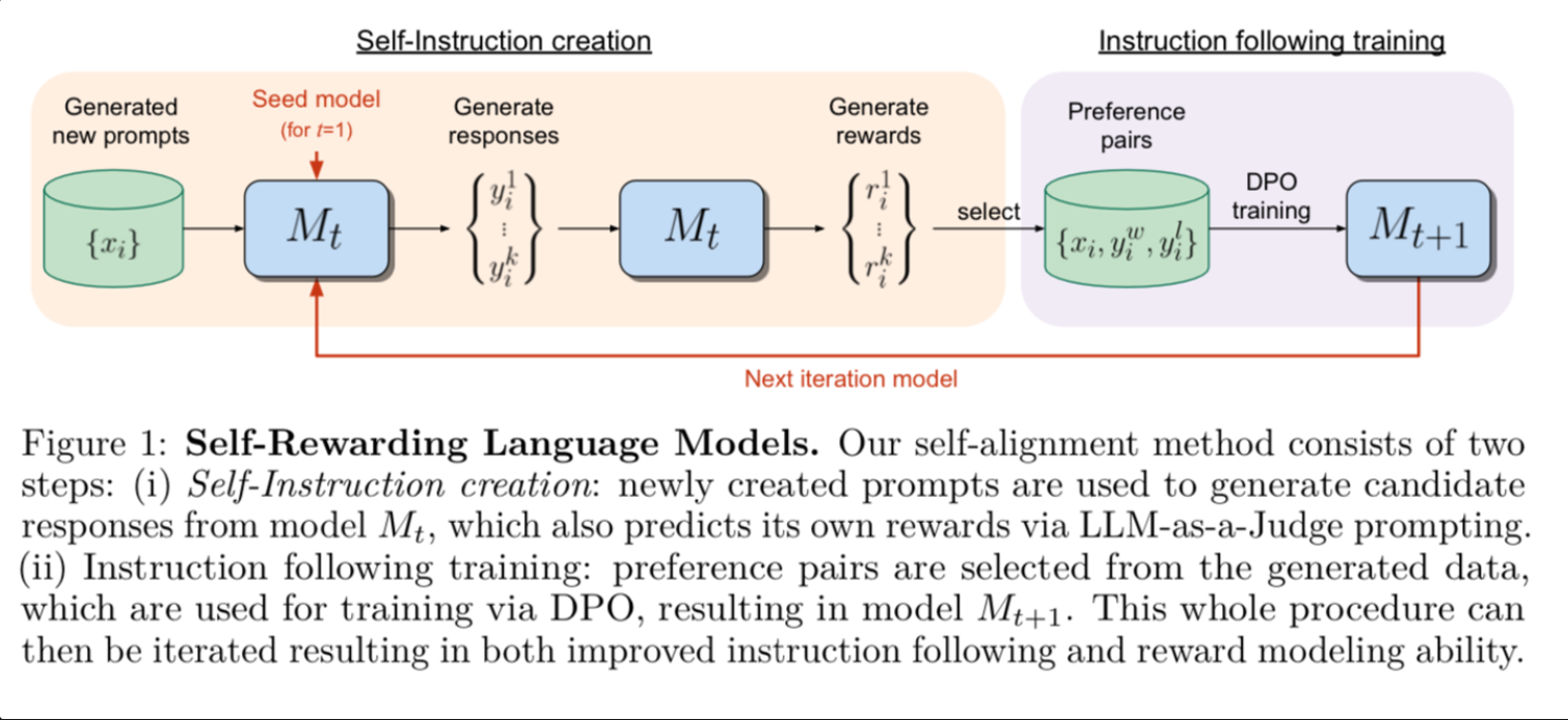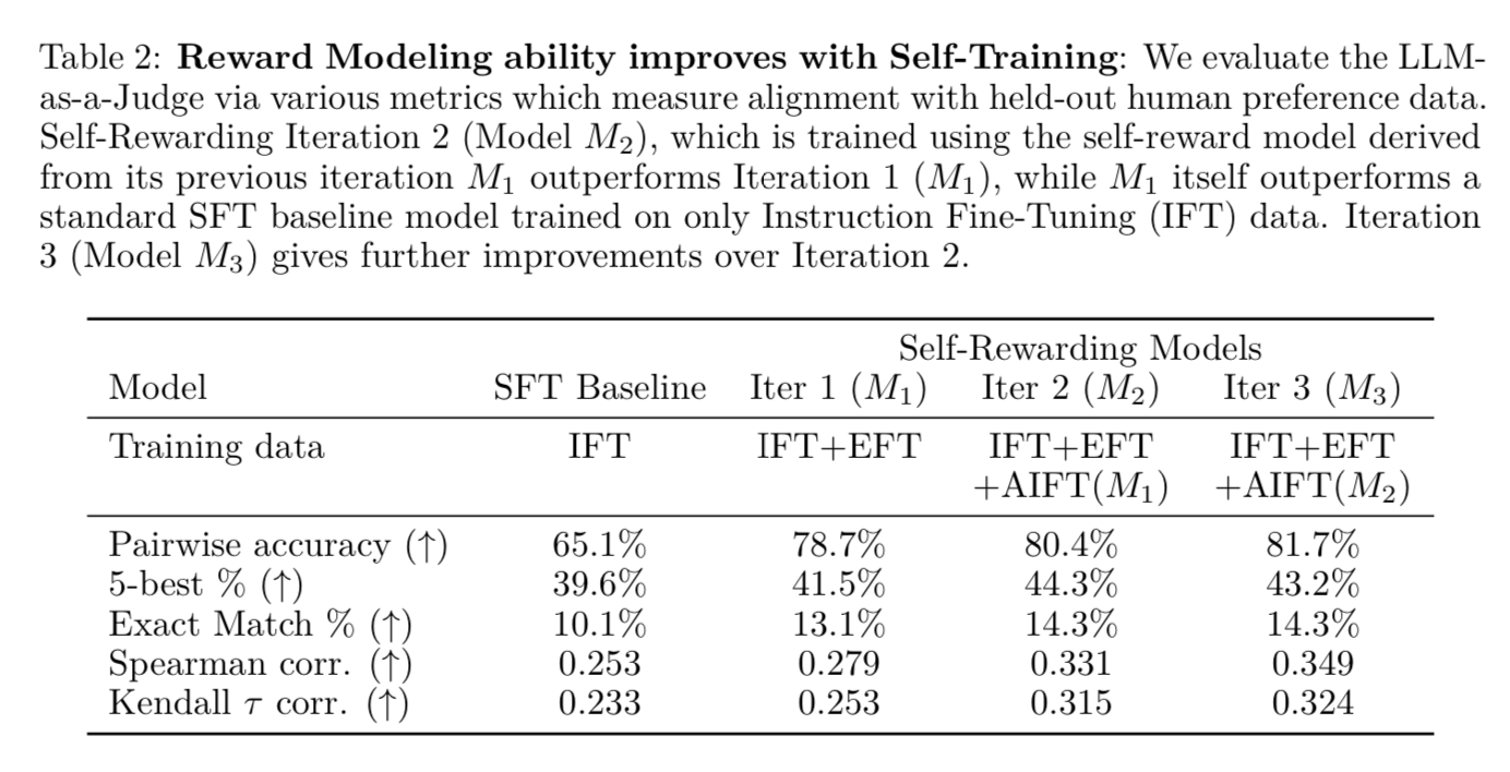 The interesting thing about this paper is that the initial LLM learns to be it's own judge. They are not using a separate, smarter language model like GPT-4 as the judge. So not only does the base model get better at instruction following, but it gets better at judging it's own outputs. This means as we iterate through training, we will each time we train a new model we will have a higher quality preference dataset than the previous iteration.