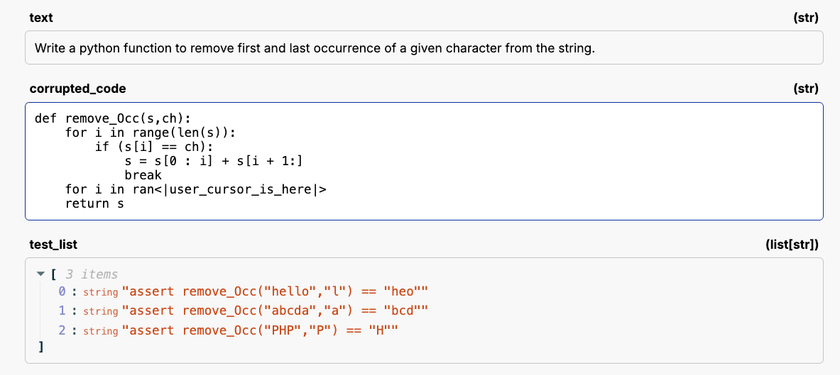 We ran the corruption on three different datasets: the MBPP dataset, python instructions 18k Alpaca, and the Marimo codebase itself. The Marimo codebase was the most interesting to gather. We went though their PRs and took the code in the diffs, took that, corrupted a bit of it, and put the PR comment as the intent: