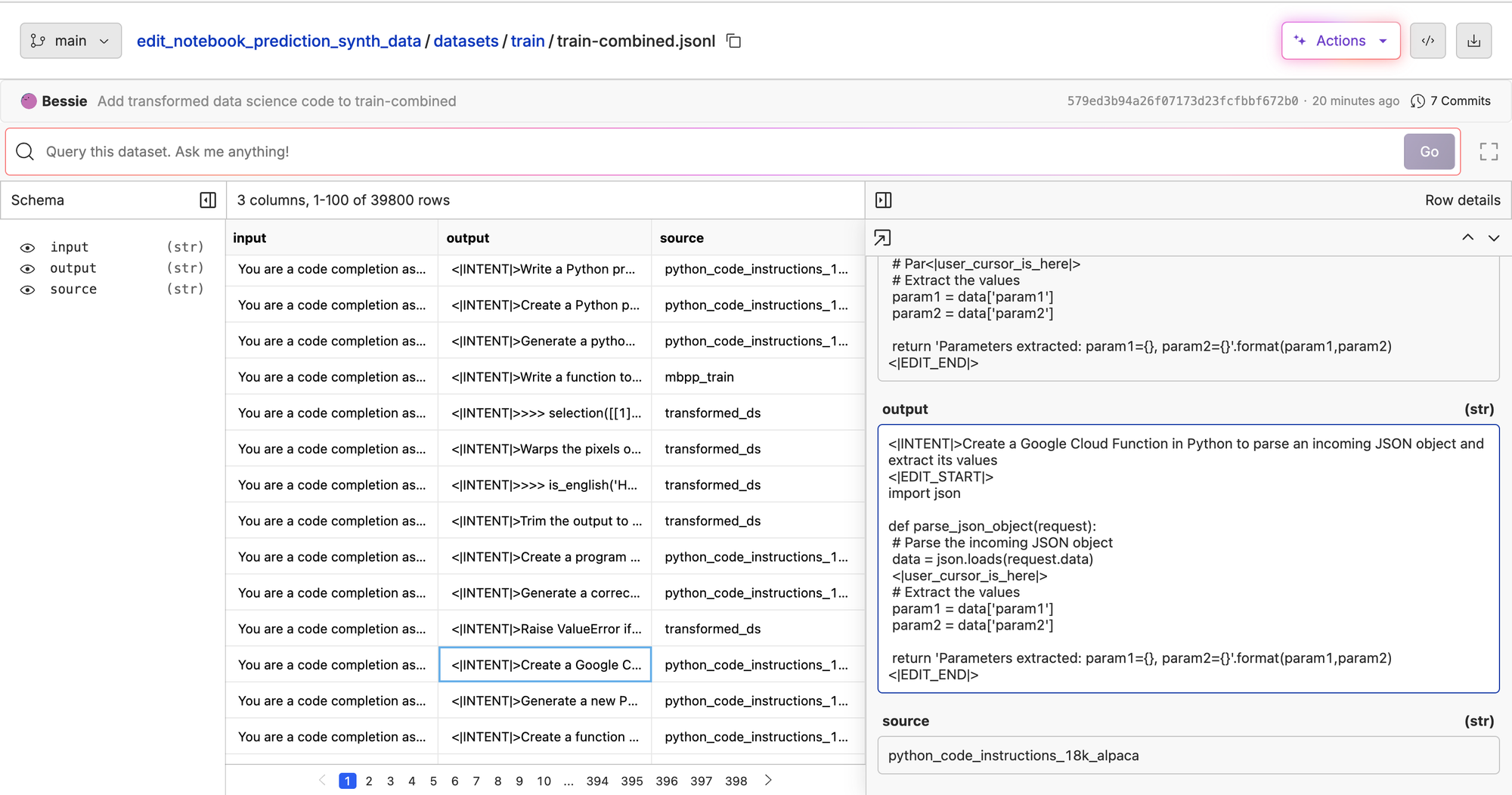 There are a few important pieces of our raw prompt and response. First we have an optional <|INTENT|> block in the input that allows the user to put in their intent for the edit. This is nice for "Command K" style edits of a code block. You will also see the <|INTENT|> block in the output. The model is explicitly trained to output it's intent before responding. This can be thought of as "think" tokens so that the model can plan a little before making the edit. It also makes the edit a little more debuggable. The idea is that the intent that the model predicts can also be show to the user and the user can help course correct.