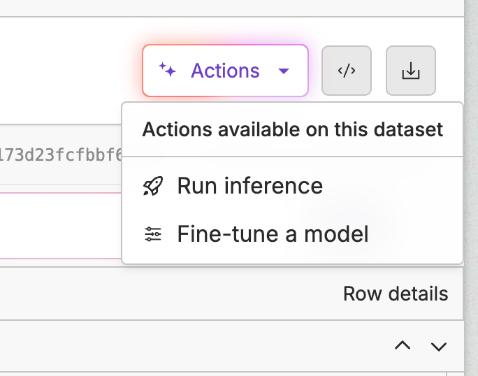 With the data prepared, and our eval setup, we have 99% of the work down. Now all we have to do is run a run our fine-tune in Oxen.ai. This can be done from the dataset, by clicking "Actions", then "Fine-Tune a model".