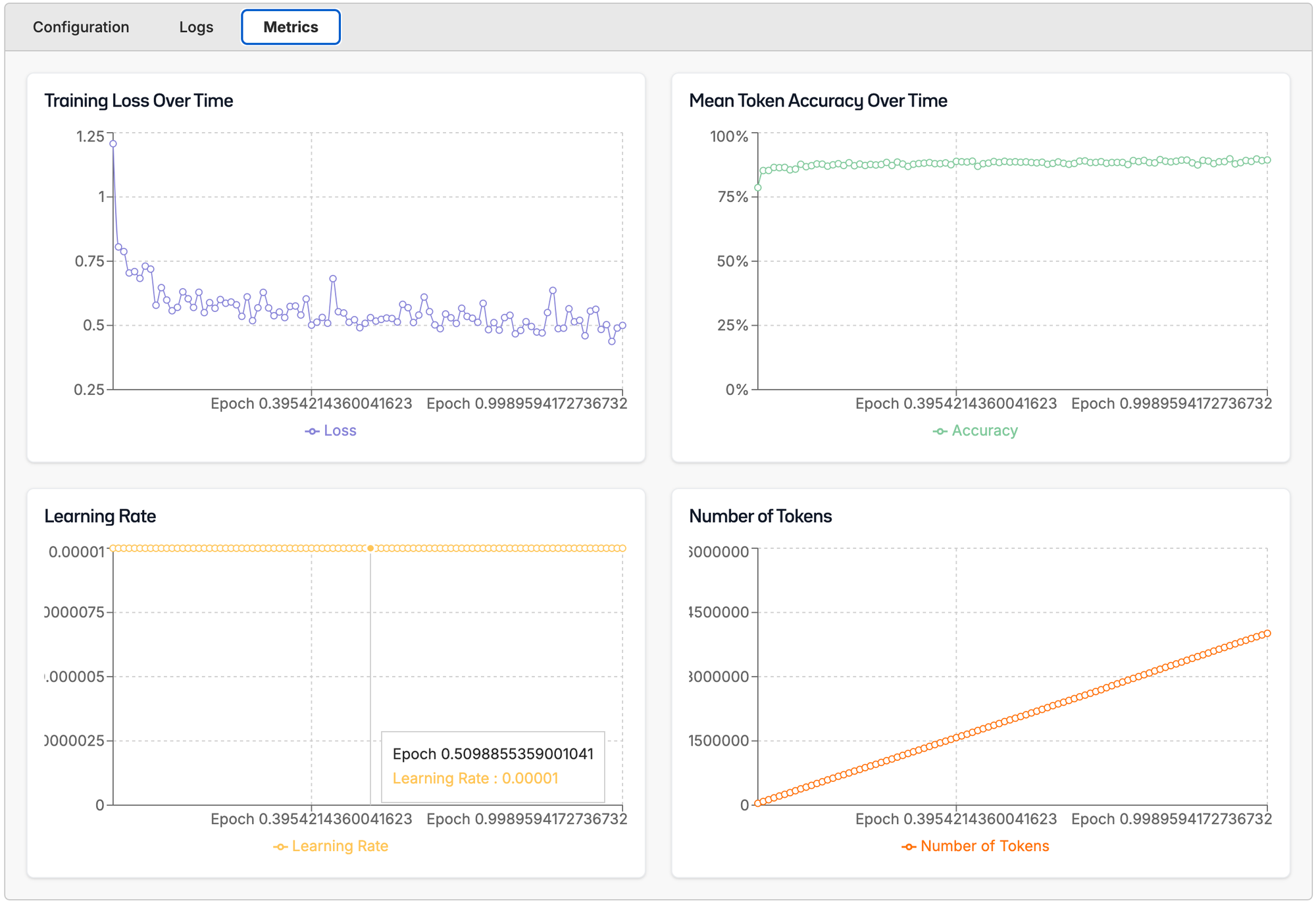 Then as the model is training, we'll be able to see our metrics, logs, and config!