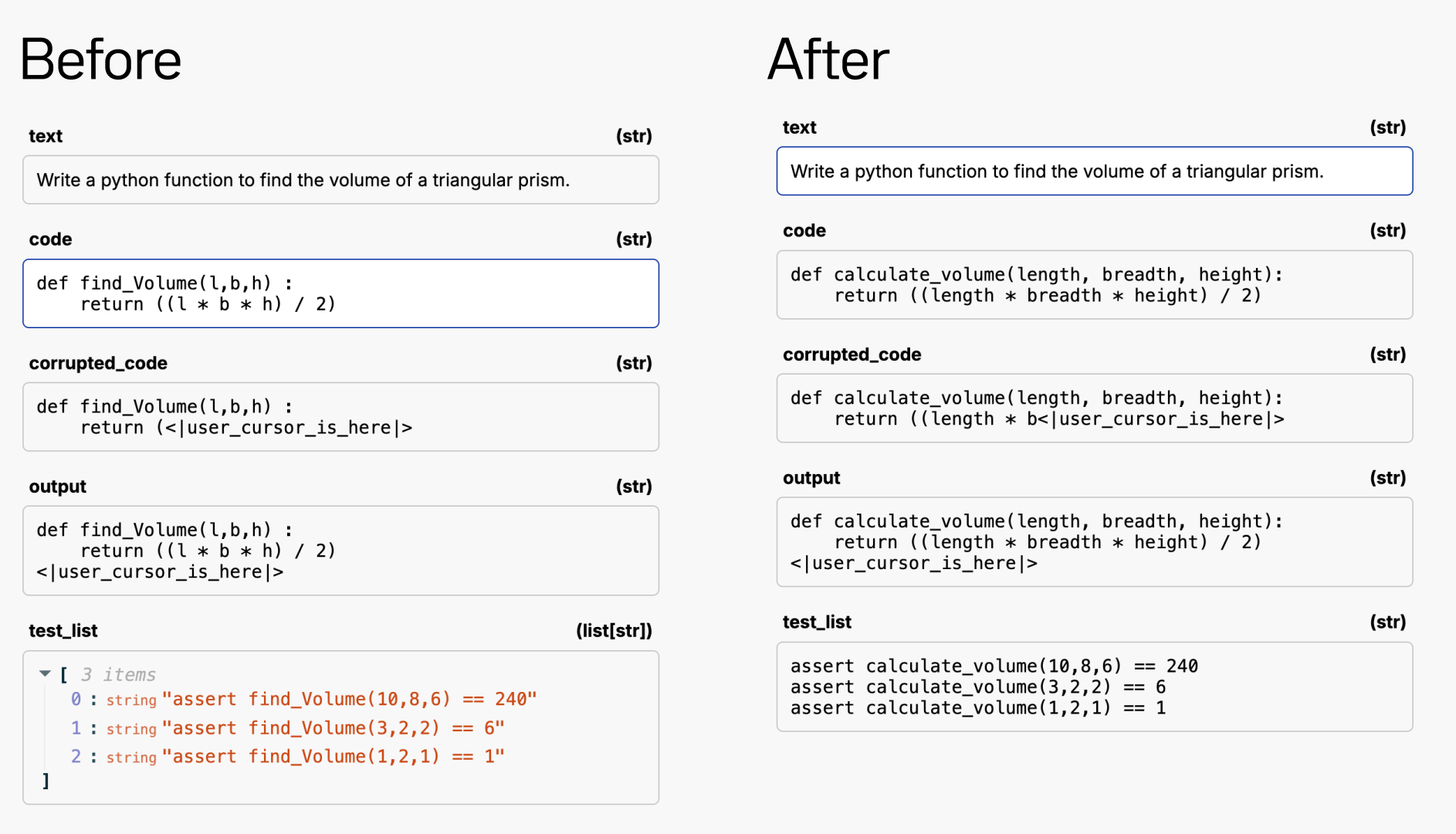 To combat this, I had an LLM rewrite all of the variable and function names. I used GPT-4o to simply rename the function and variable names, then ran all the unit tests again to verify the LLM didn't hallucinate. Here is an example of before and after the renaming.