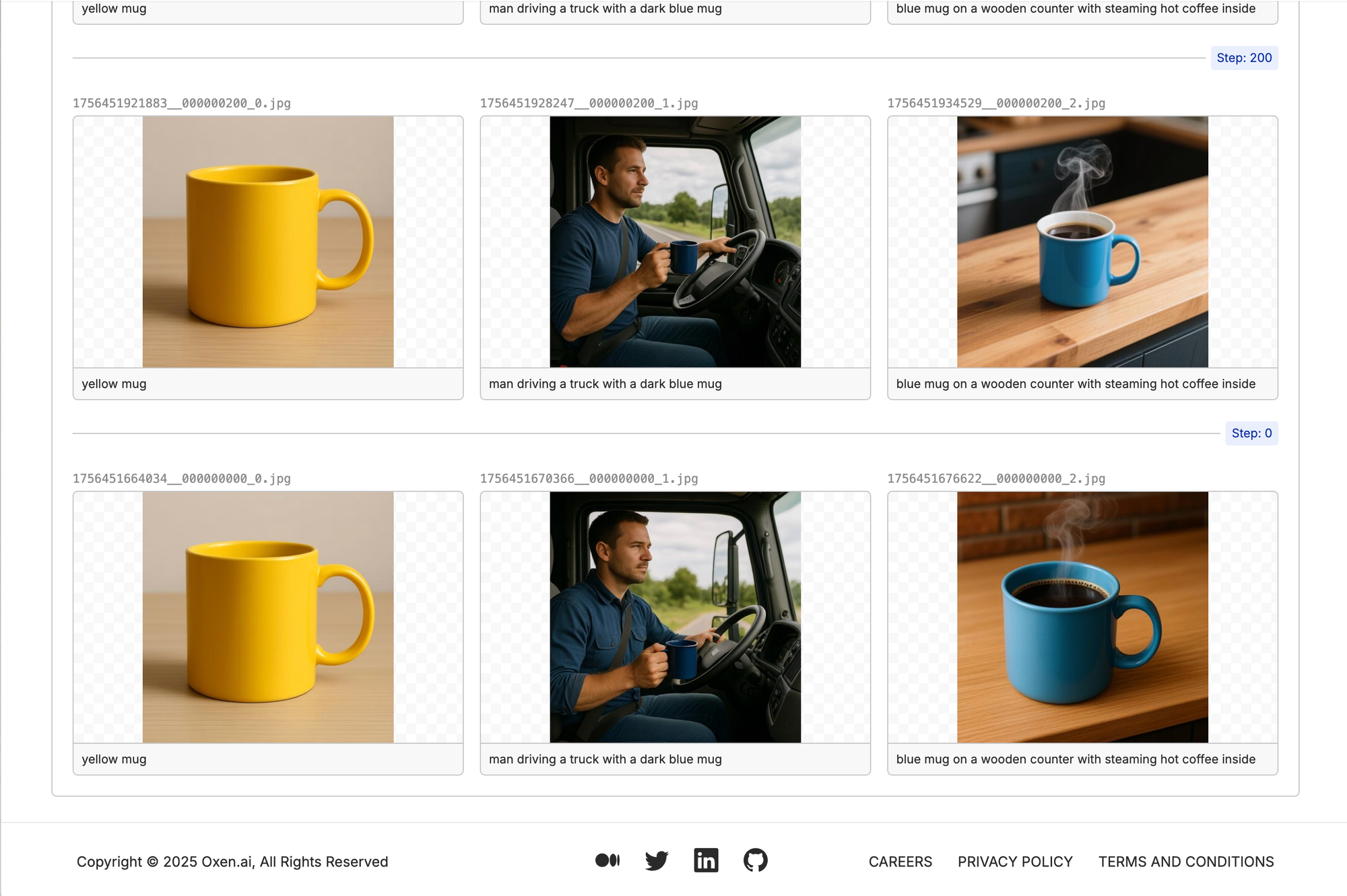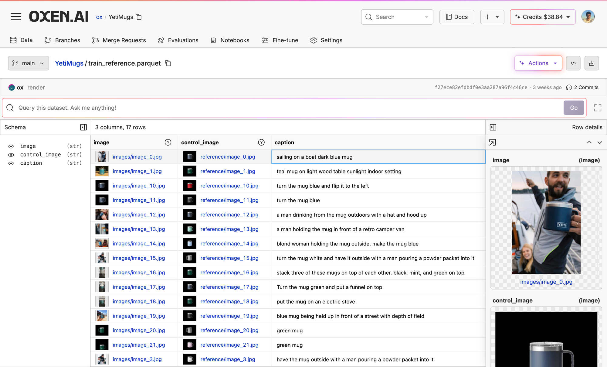 First, we pulled 17 images of Yeti mugs in different settings from Yeti's product catalog and then paired them with a close-up image of another mug without a setting. The standalone mug serves as our control image, while the catalog images would be our example generations. We then wrote in captions in the UI and voila...our dataset is ready.