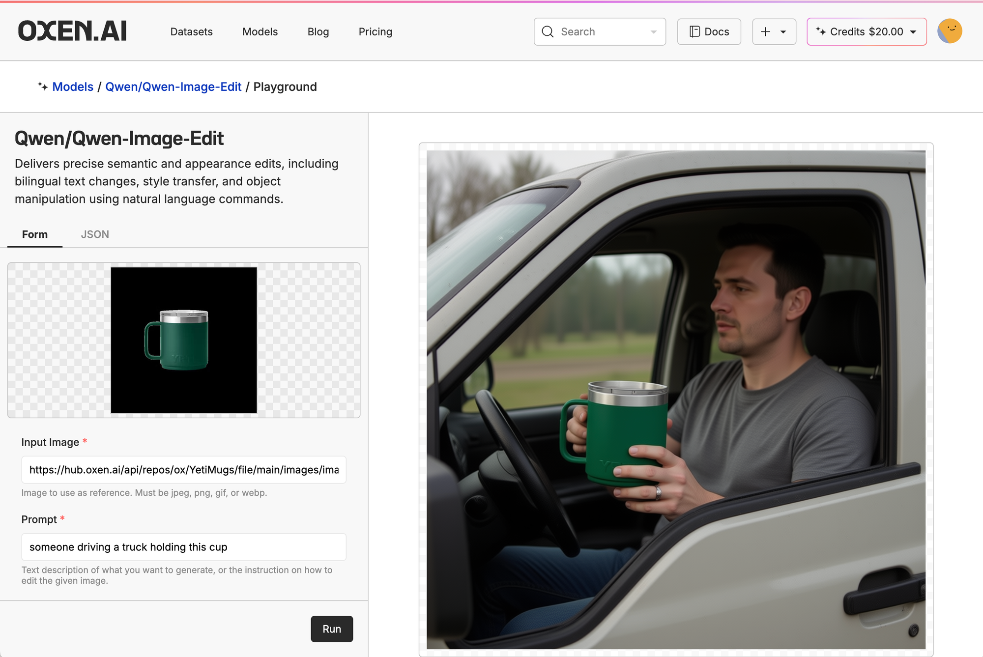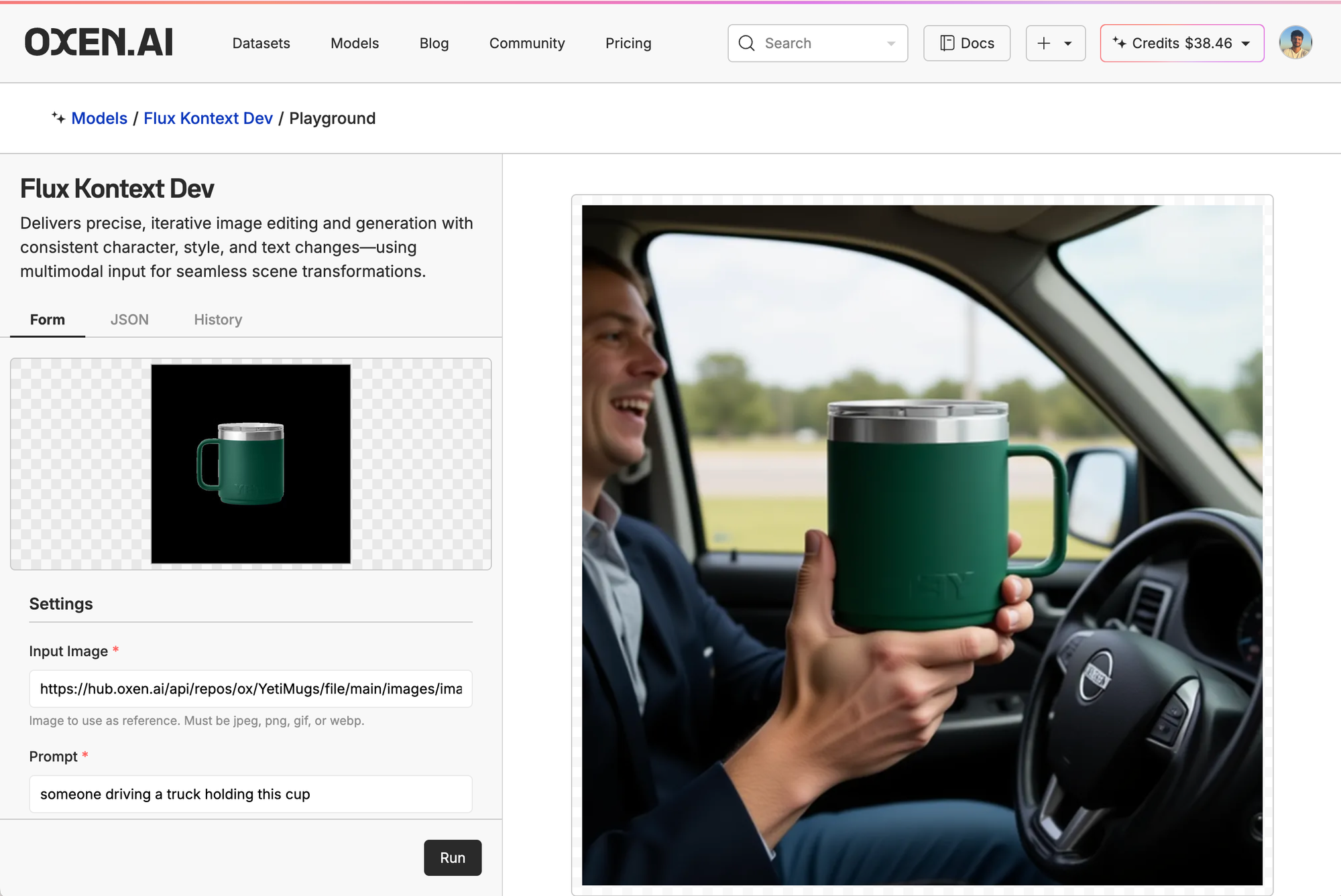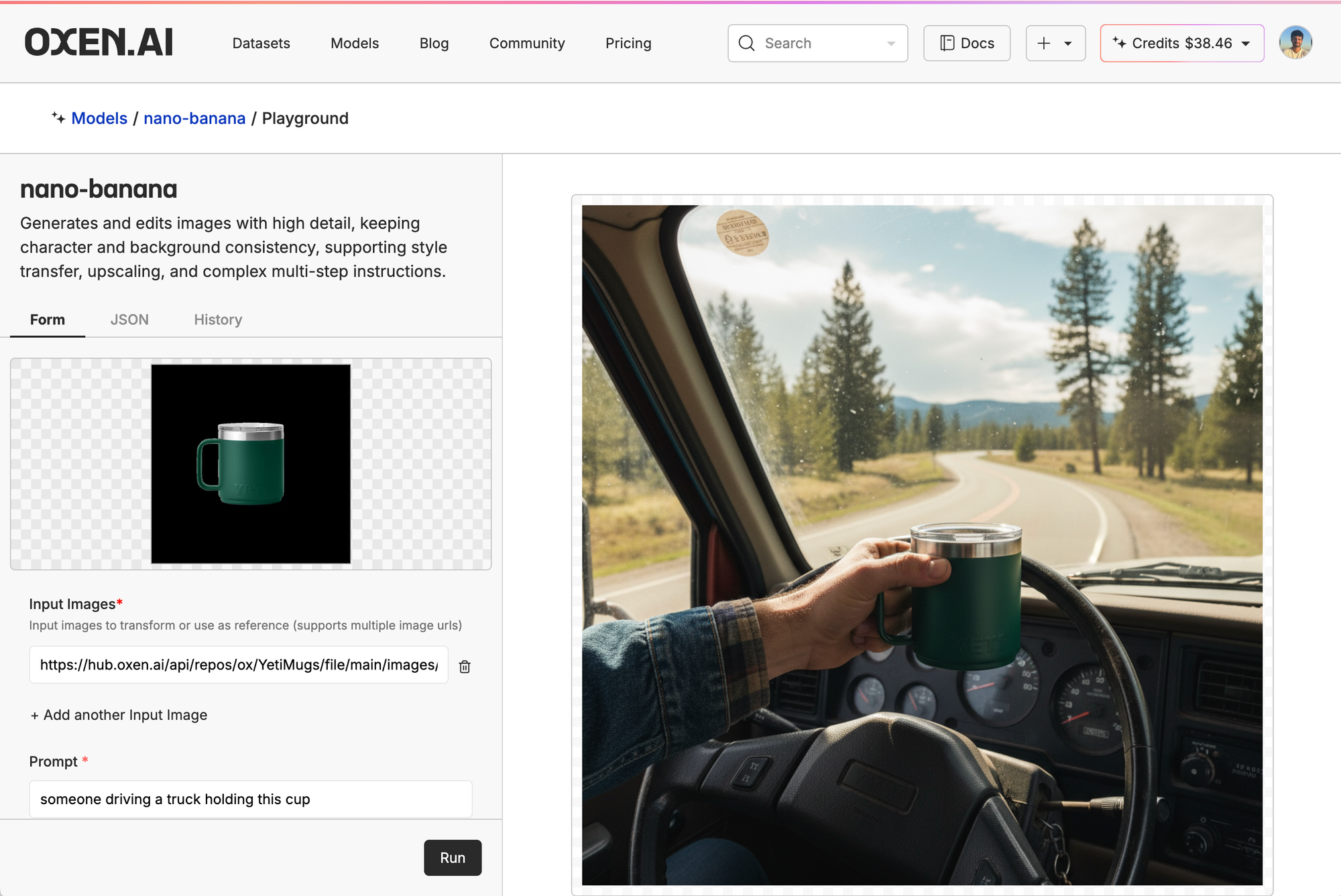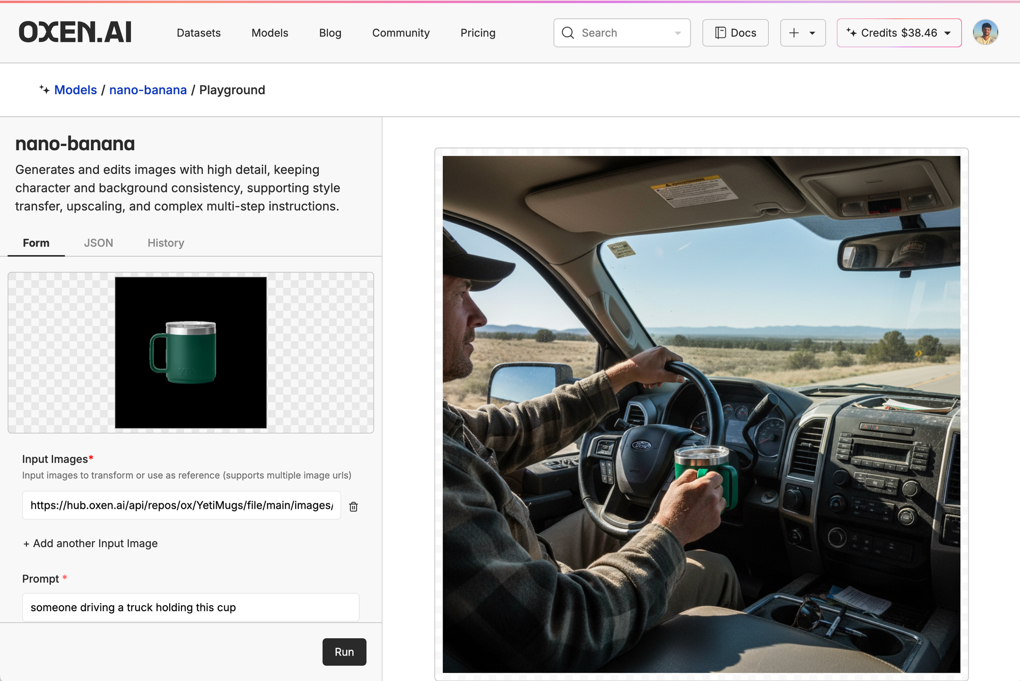 Then, we clicked the little ship in the top right of the model card, put in our control image, and prompt. Here, we're just asking it to generate a picture of someone driving a cup holding the mug.