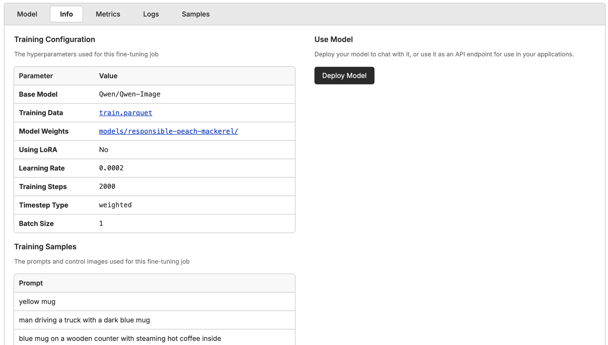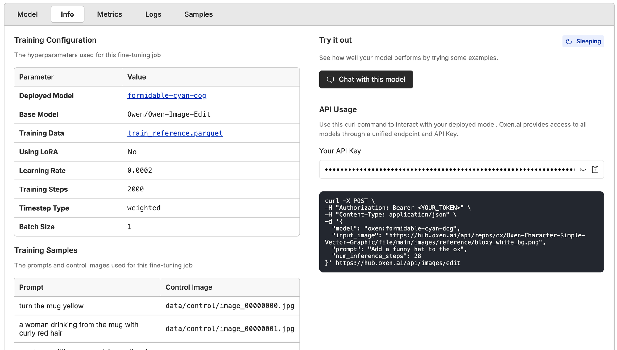 If you want to simply run your model on Oxen.ai, just click deploy in the model info page after the fine-tune ends, and you'll get a model API to ping.