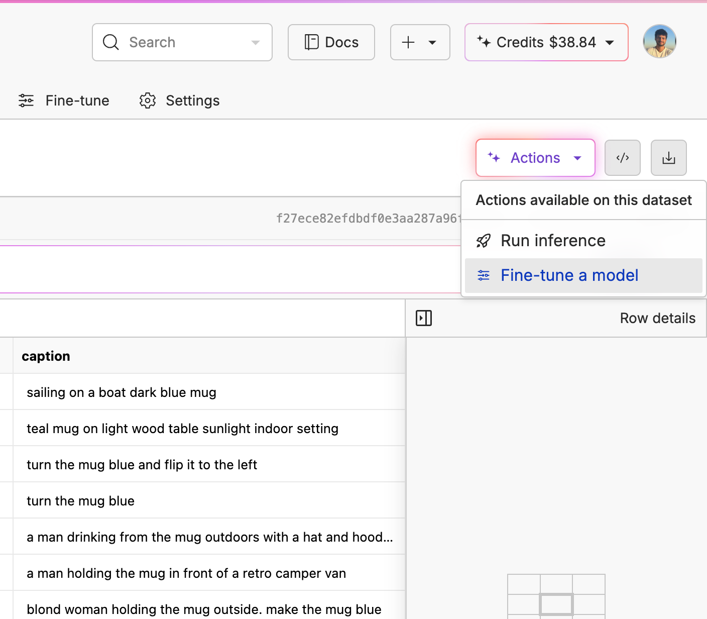 Inside our dataset, we simply clicked the "Actions" button, then "Fine-tune a model".