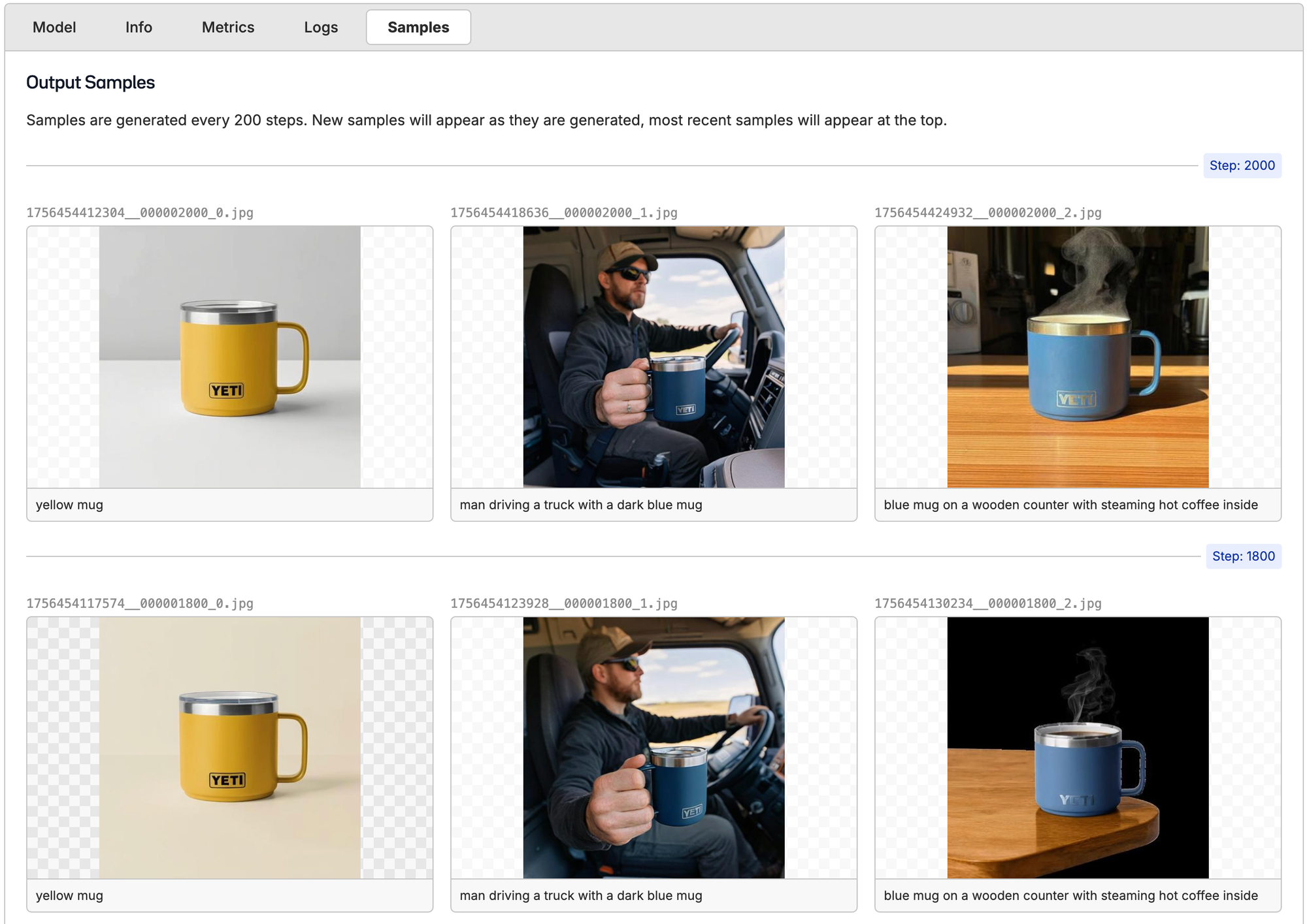 While Qwen-Image-Edit is fine-tuning, we'll get to see how the training run is going with samples every 200 steps, metrics, and logs. Here are the first samples, for example. The quality of both the mugs and the person is horrible. There isn't even a Yeti logo on the mugs, and they just look like generic AI-generated mugs. Let's see how they progress with time.