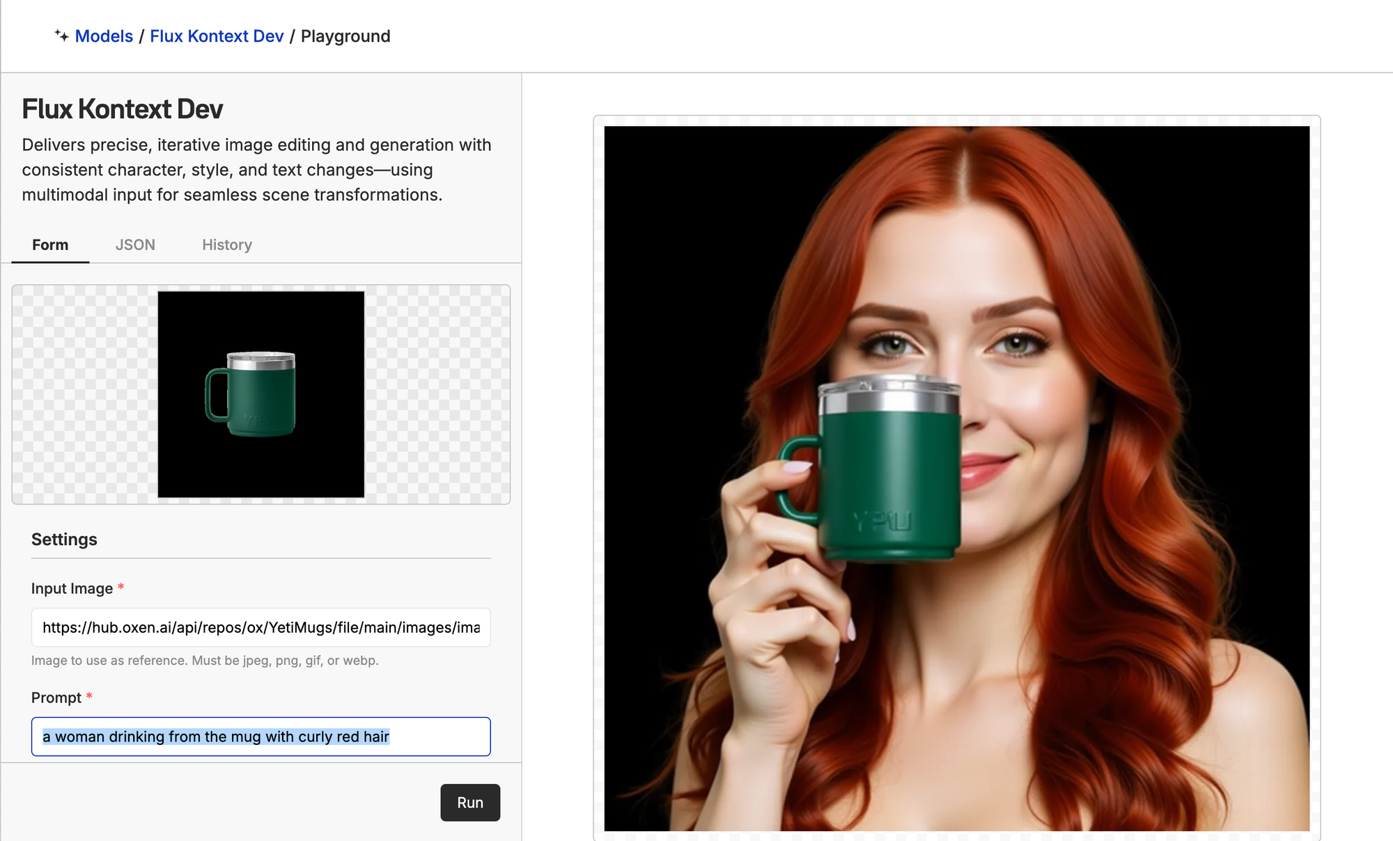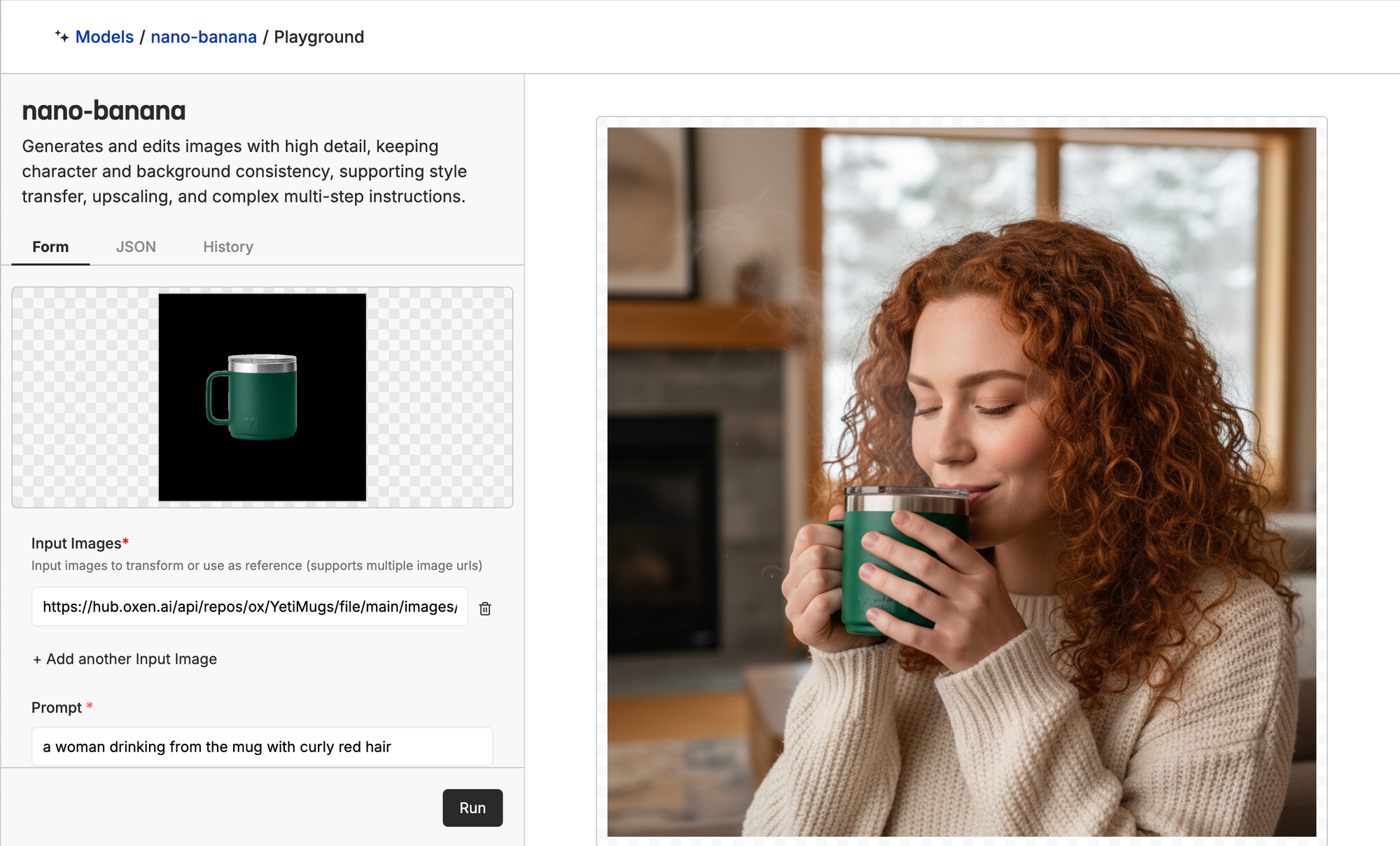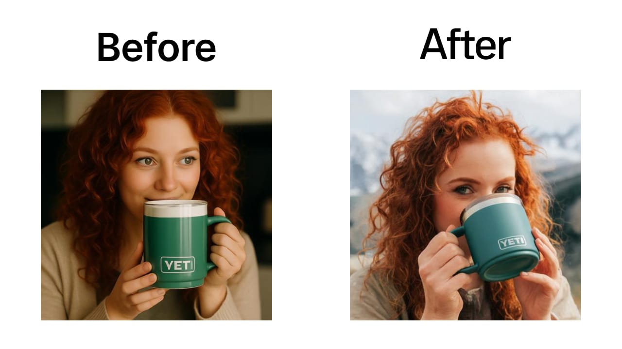 In another run, we got super impressive results with a more realistic-looking redheaded model and another perfect mug. Here is a before and after of an early iteration vs later on.