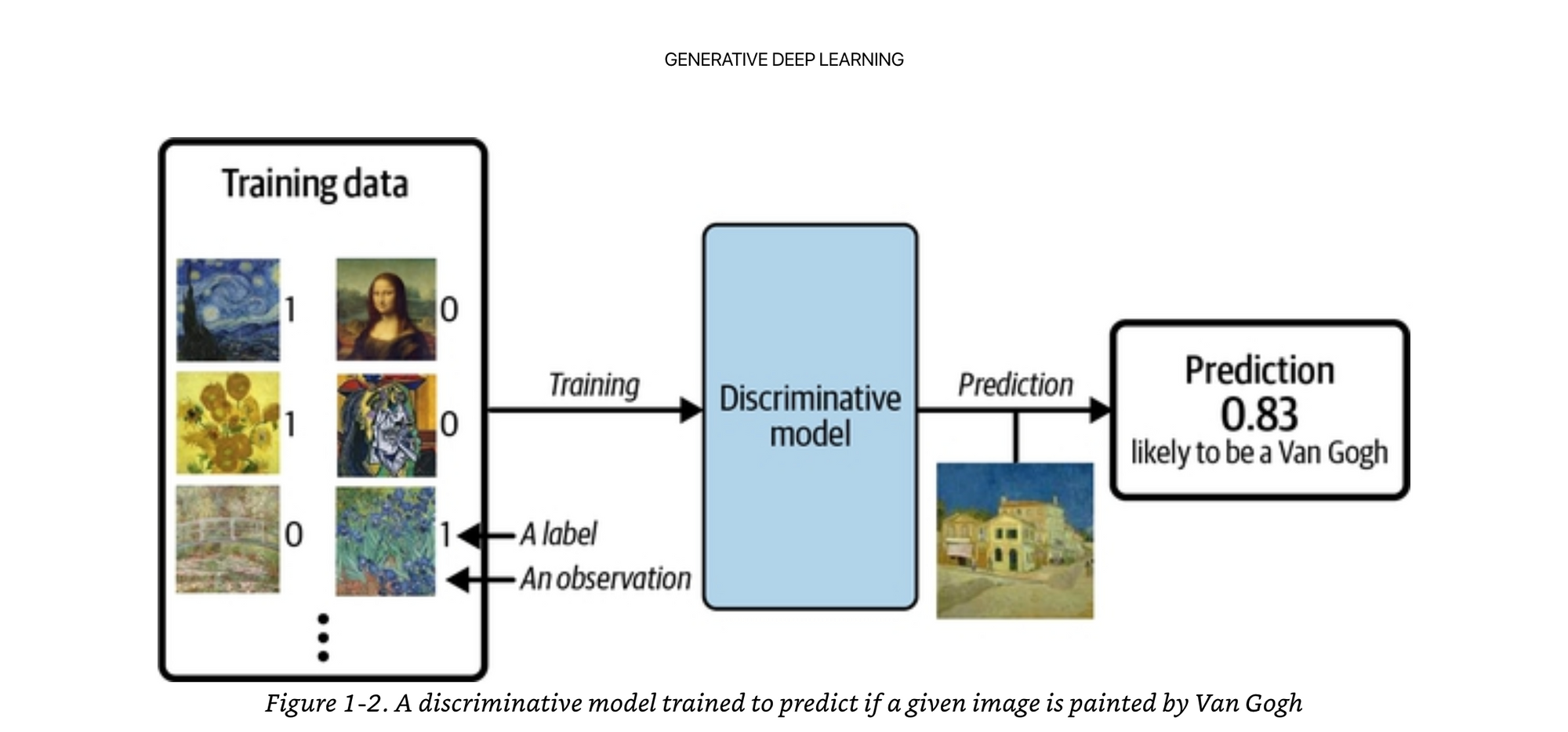 “An important point to note is that even if we were able to build a perfect discriminative model to identify Van Gogh paintings, it would still have no idea how to create a painting that looks like a Van Gogh. It can only output probabilities against existing images, as this is what it has been trained to do. We would instead need to train a generative model and sample from this model to generate images that have a high chance of belonging to the original training dataset.”