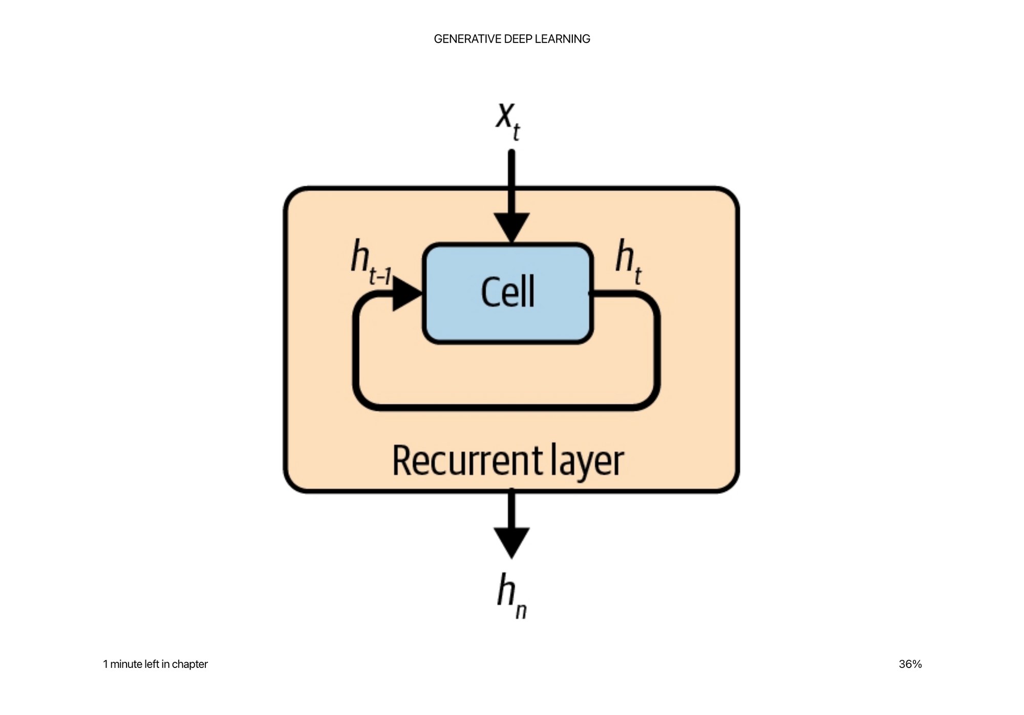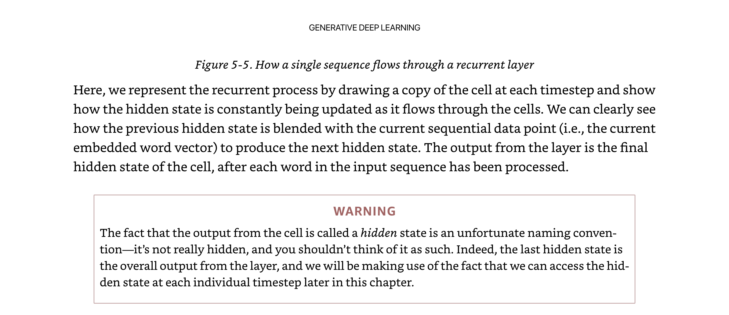 The inputs and outputs to the cell at each time step are called hidden states and are updated as you go along the sequence.