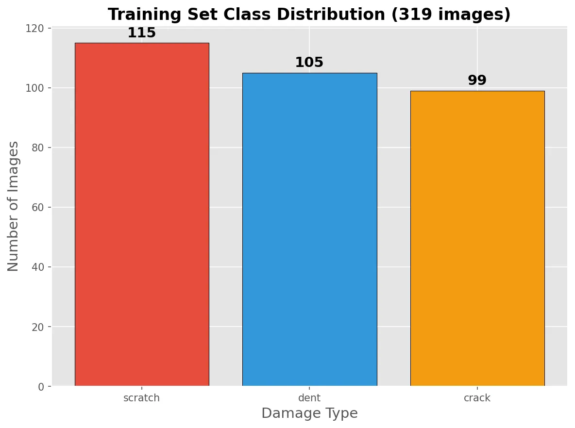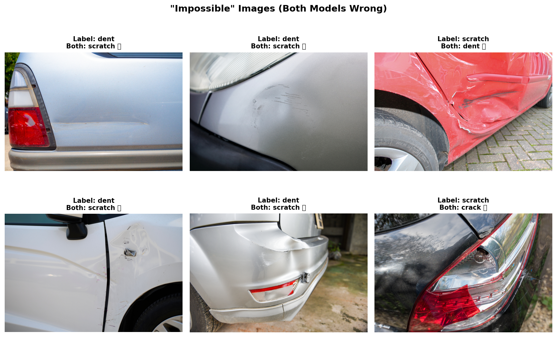 Here's the other thing we noticed: the subset of the dataset we chose uses single labels, but real car damage is often multi-class. A crash that dents the metal usually also scratches the paint. We used majority-vote labeling from the original annotations, but keep this in mind when we get to the "impossible" images later.