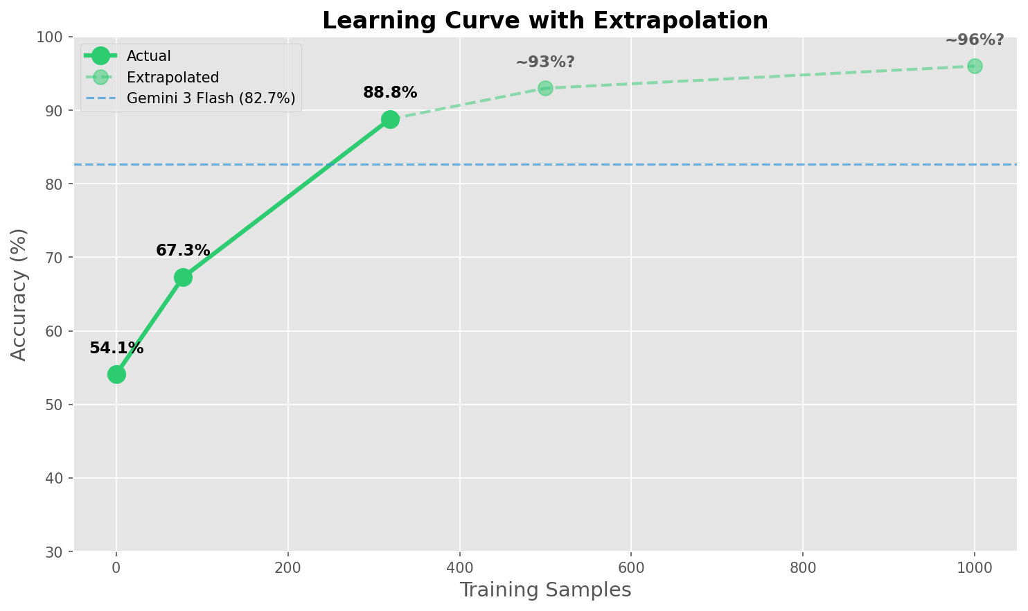 Learning curves typically follow a power law, each doubling of data gives roughly similar improvement. Knowing this, we can use every statistician's favorite party trick, a simple extrapolation, to estimate what our accuracy would look like if we added more data.