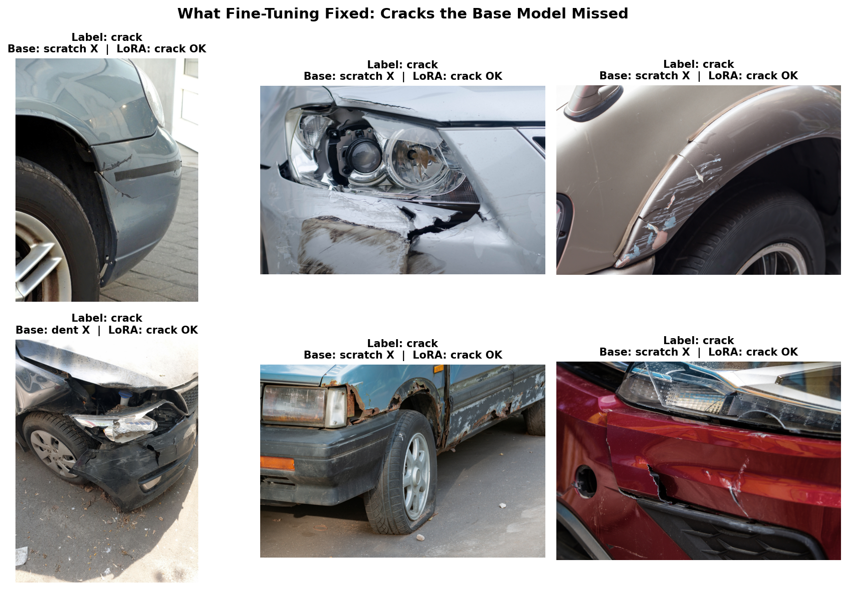 The model straight up doesn't know what car cracks look like. It keeps calling them scratches or dents.