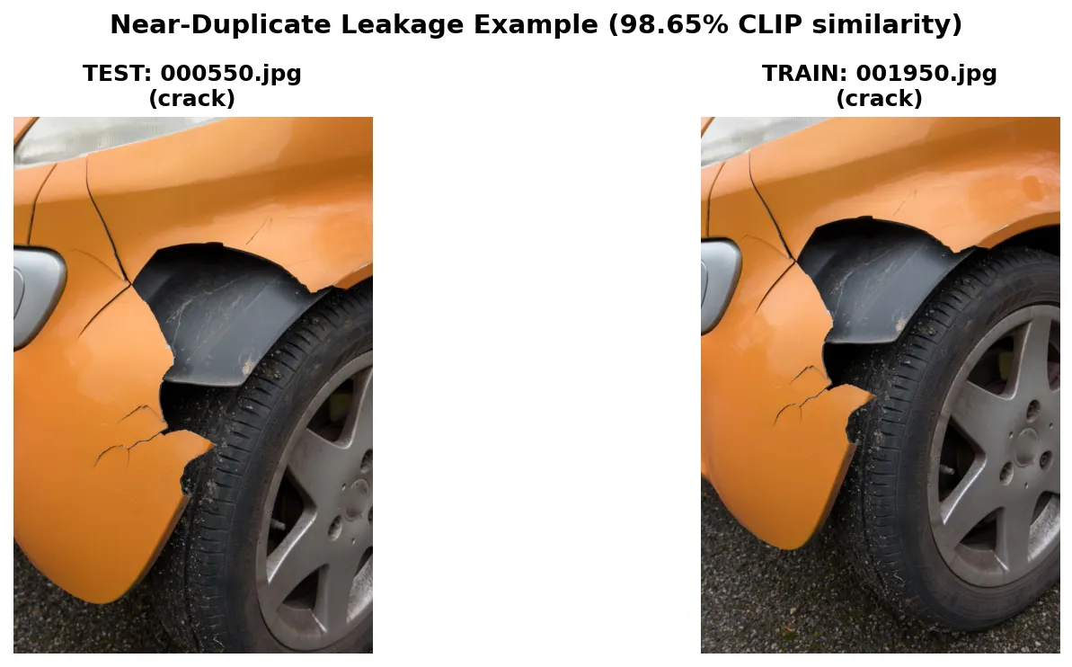 These are essentially the same photo, just slightly different crops. On a massive dataset this might be noise, but on a 417-image sample, that's the kind of leakage that lets a model memorize instead of learn (no bueno).