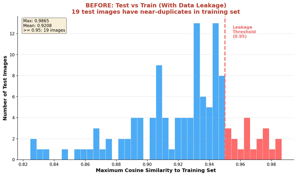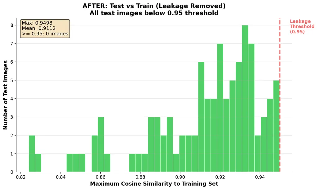 Anything above 0.95 is a red flag. We found 126 suspicious pairs, removed 19 leaked test images, and ended up with a clean split of 98 test samples ready for evaluation.